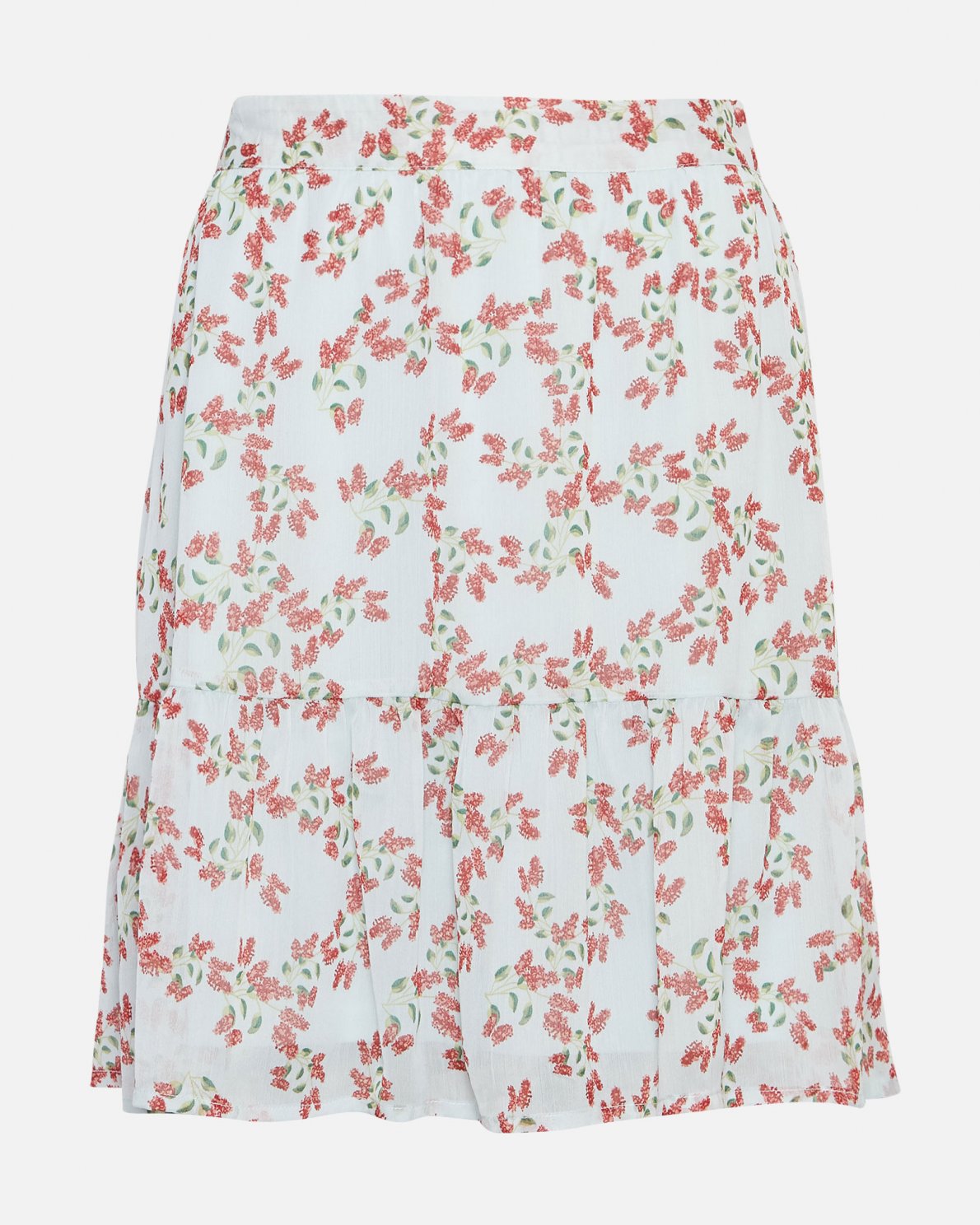 This skirt has an elastic waist with cutline details and a feminine print.