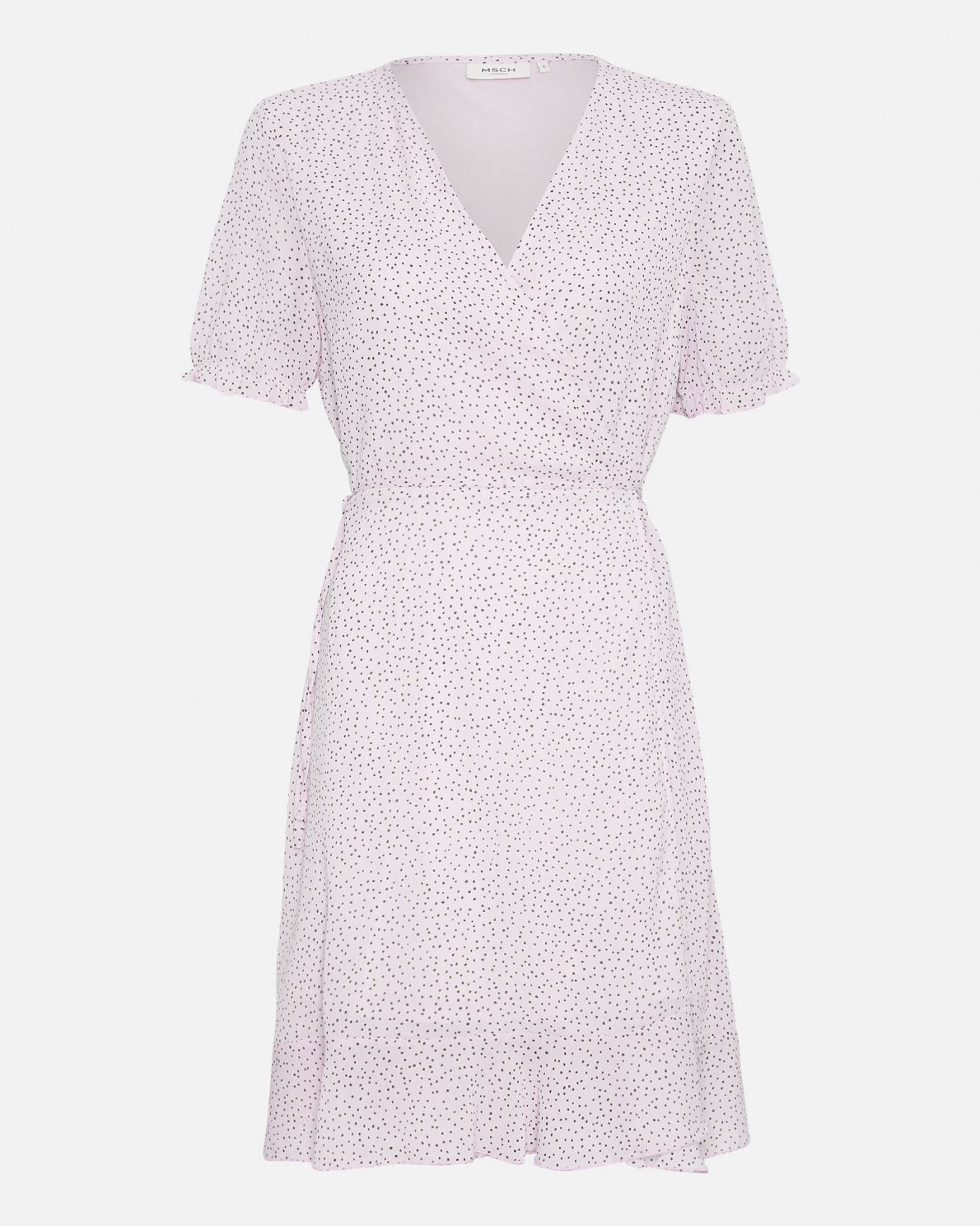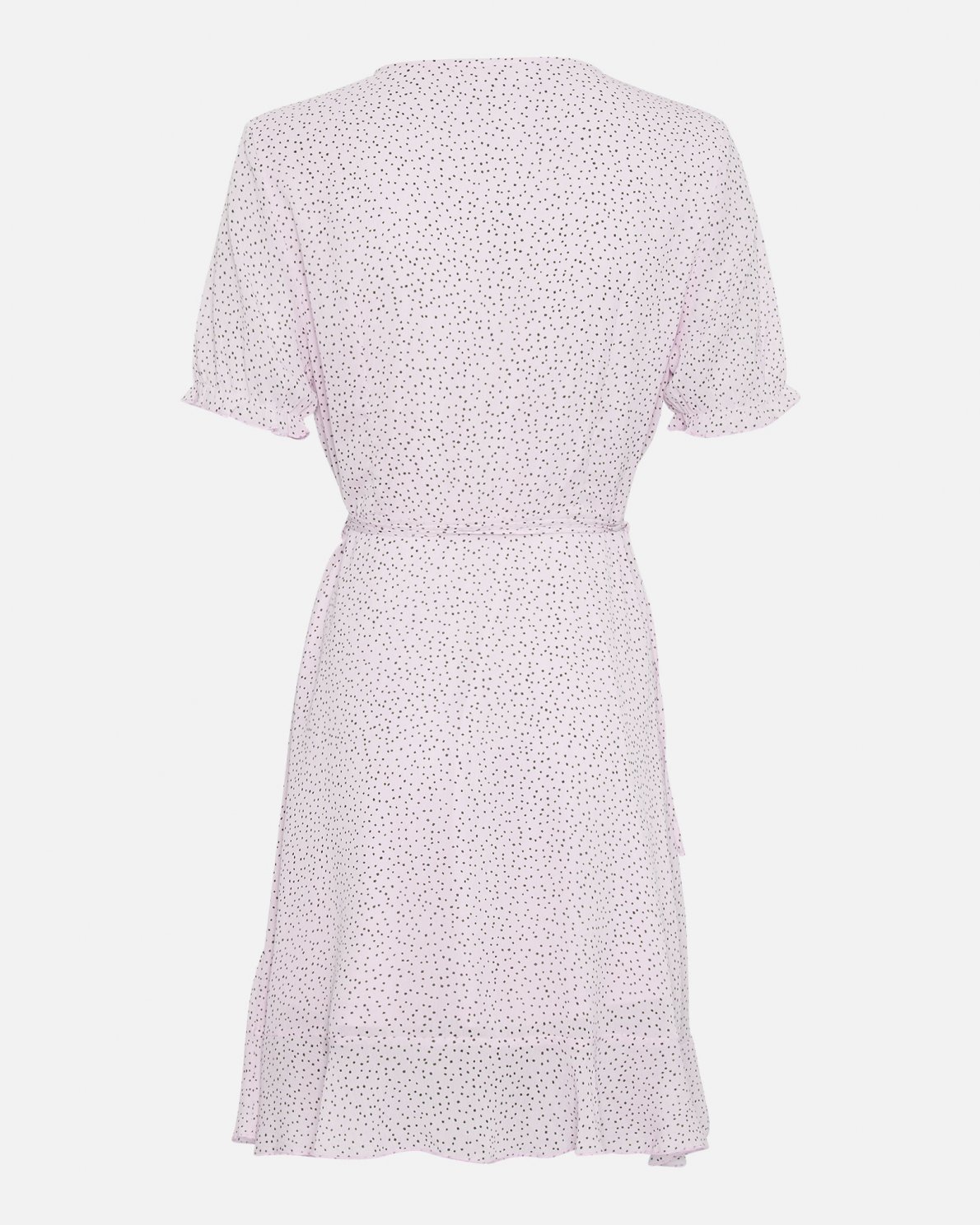 Samera is a short dress with a wrap feature and flounce at the bottom.