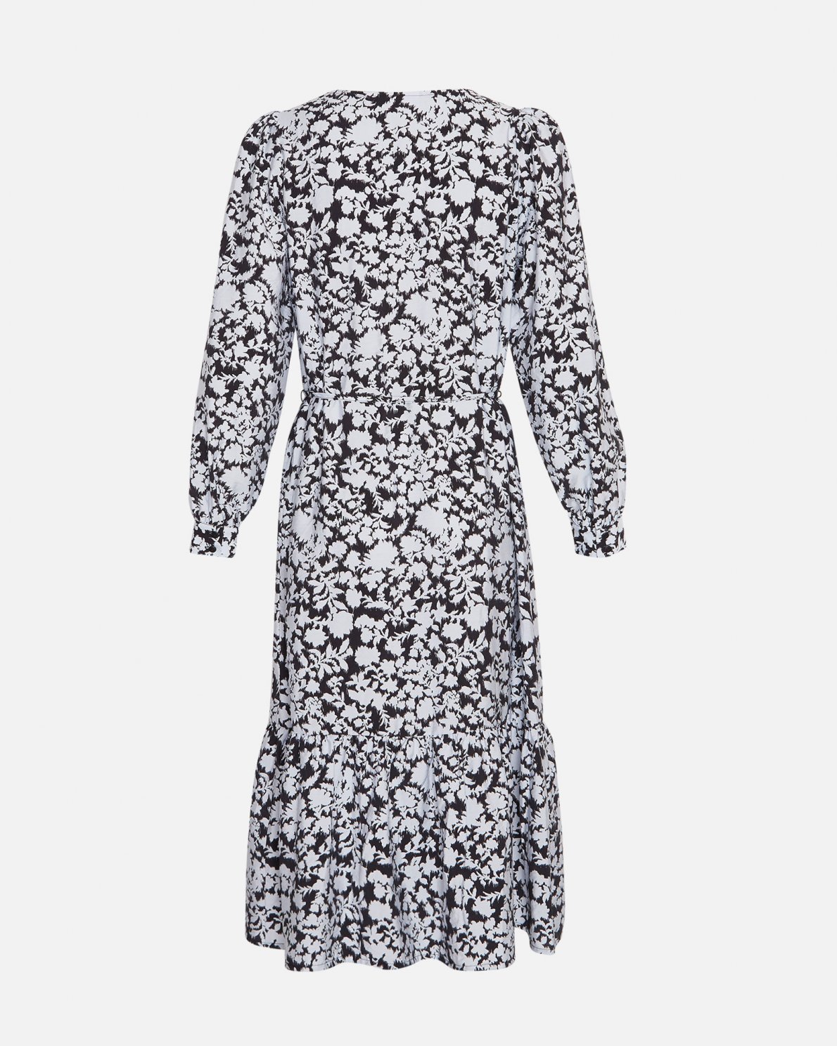 This dress is covered in a pretty flower print, with long sleeves and a tie tring waist.