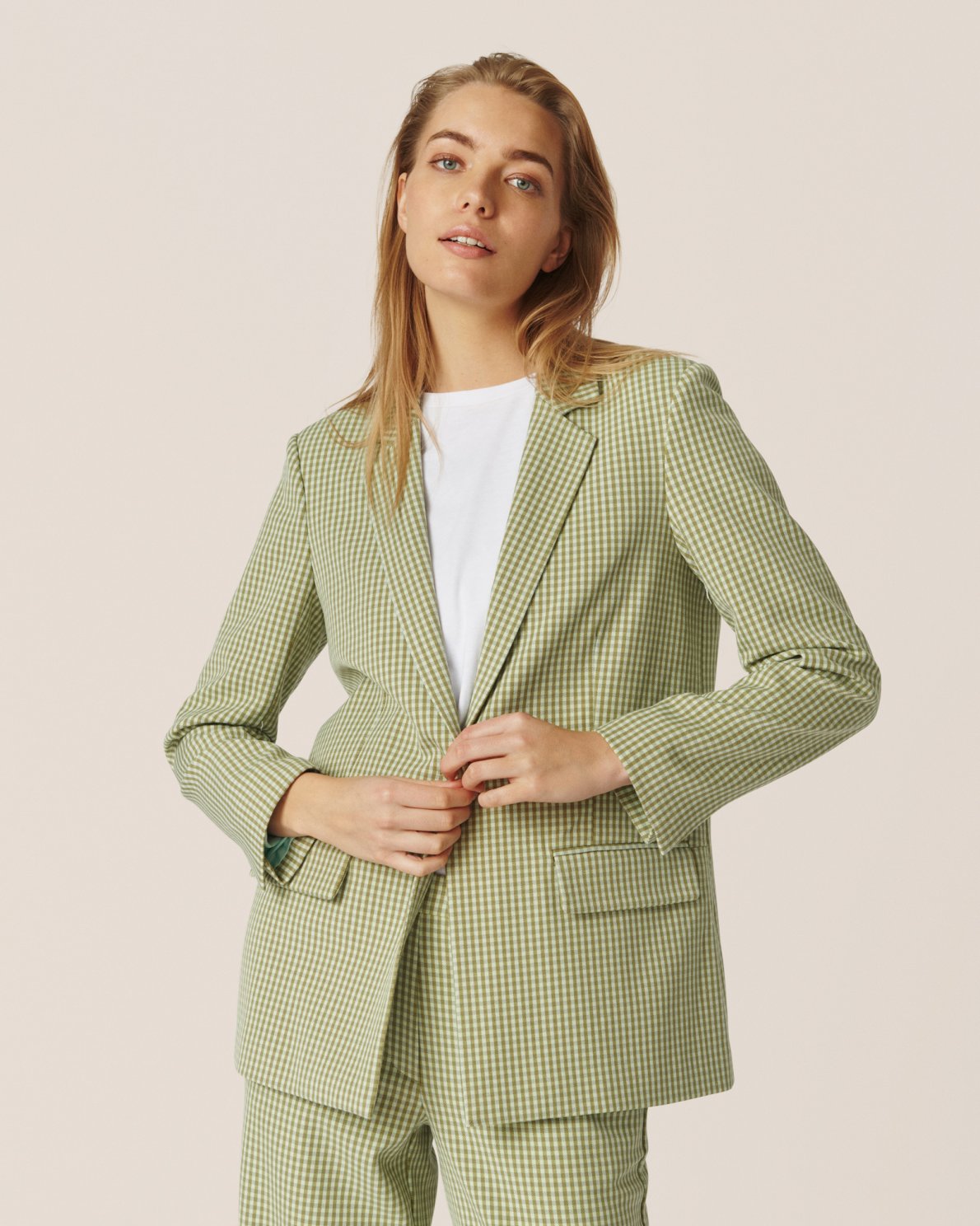 This blazer has a loose fit. The model is 177cm and wears a size S.