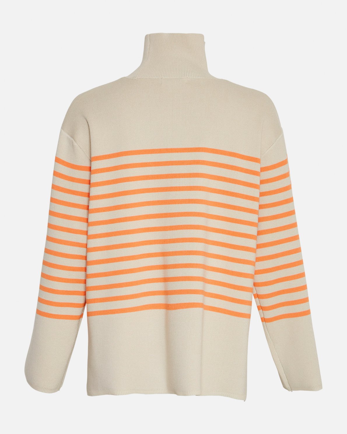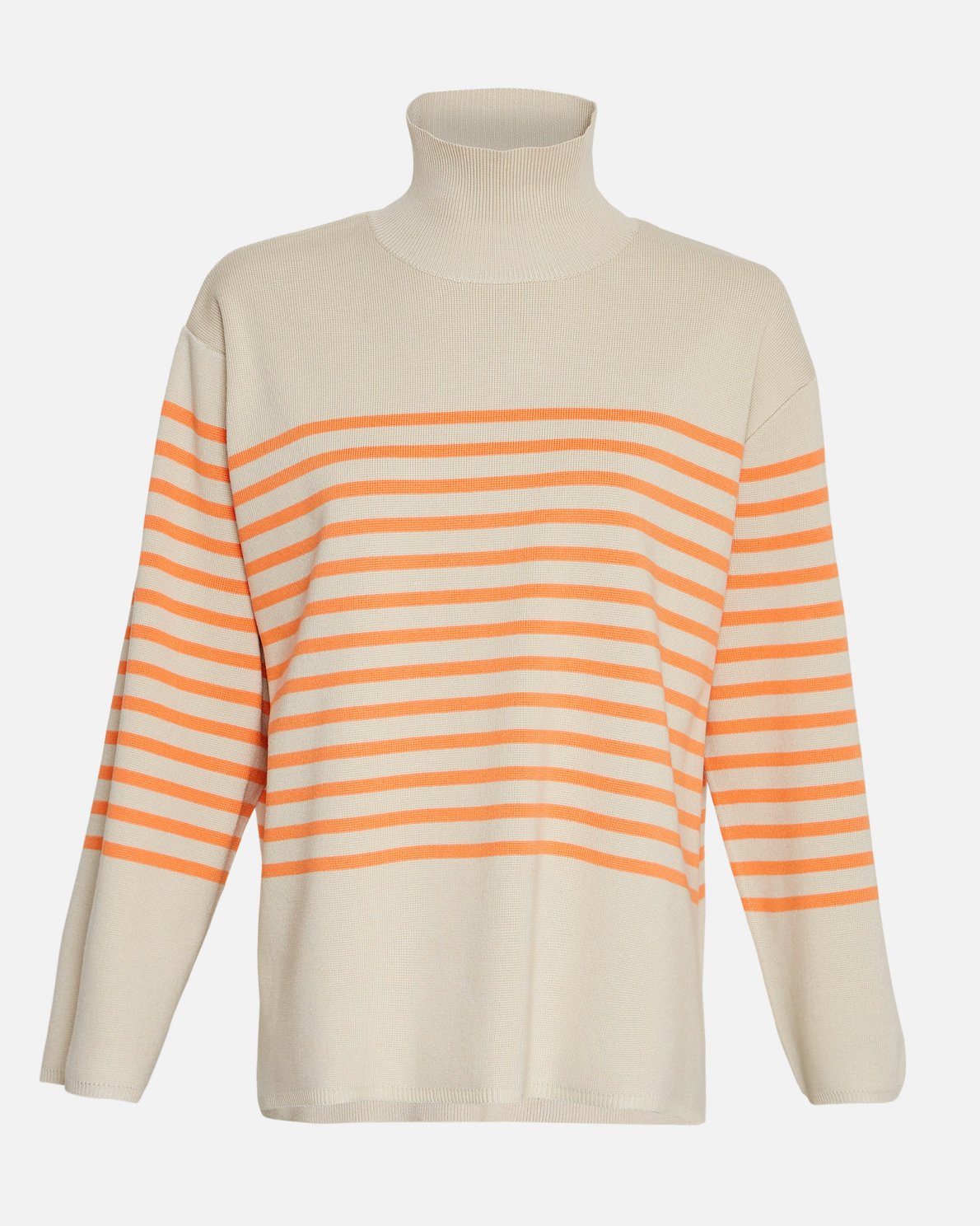 This pullover has a mock neck and colourful stripes. the shoulders are dropped giving it a casual, loose fit.