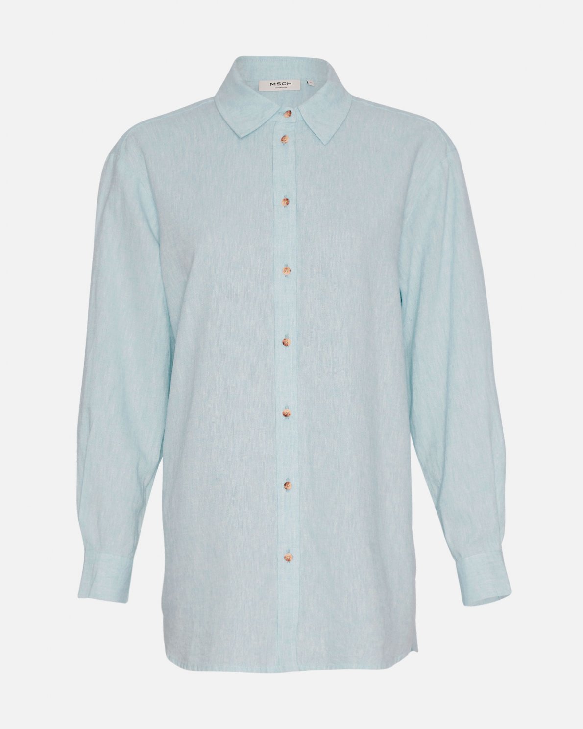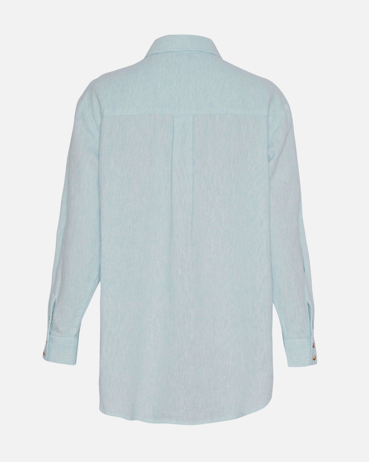 Linen shirt in a beautiful light blue colour. This classic shirt has a collar, long wide sleeves, and a button closure at the front. Style it with a matching blazer, pants, or shorts.