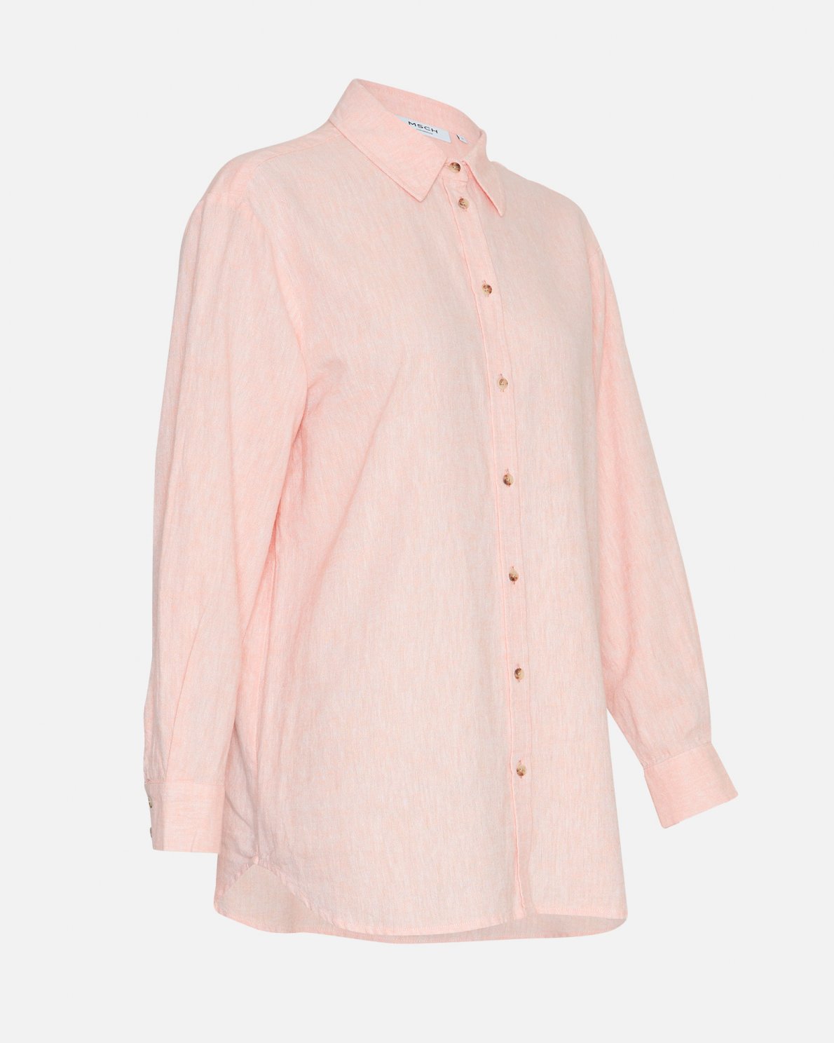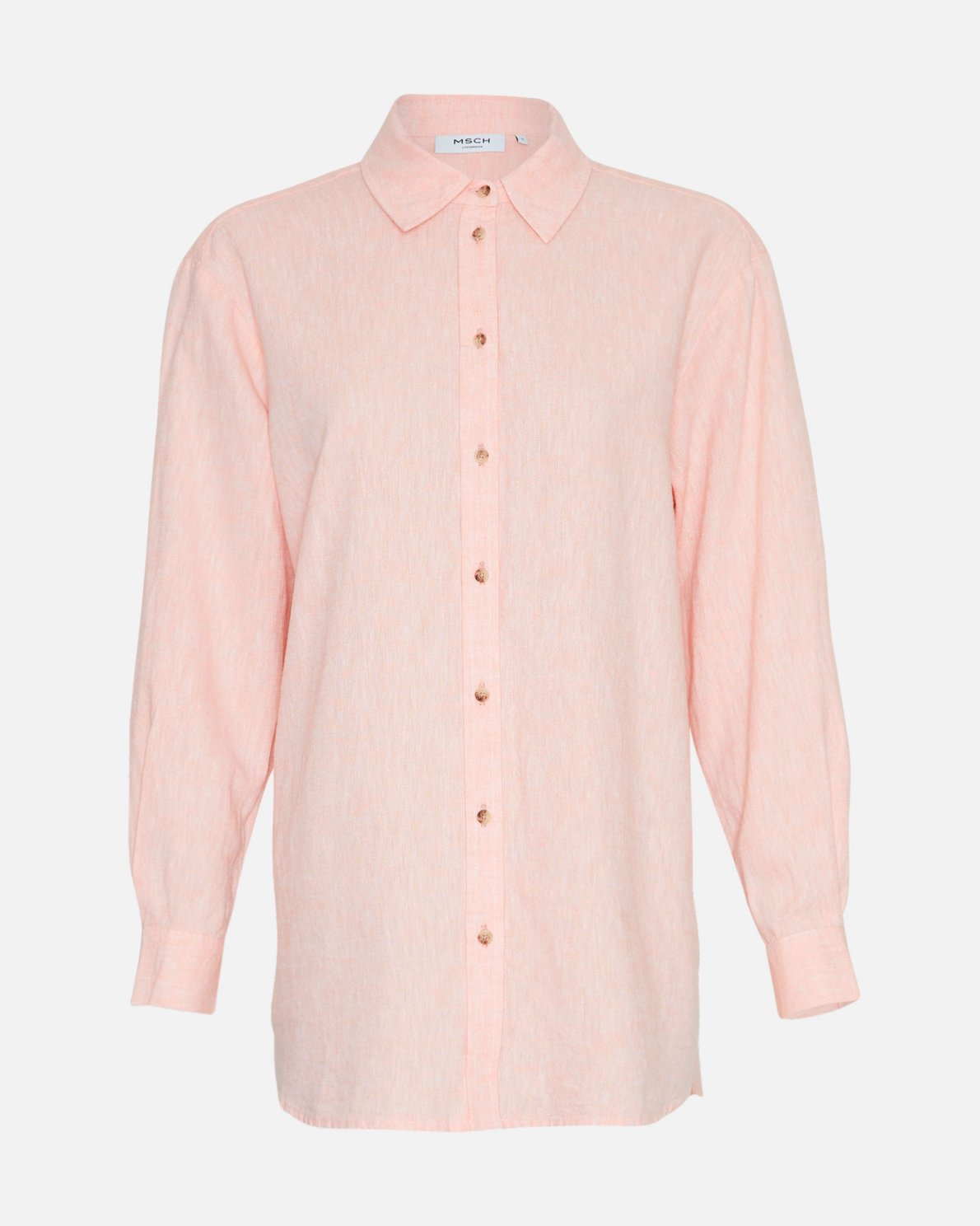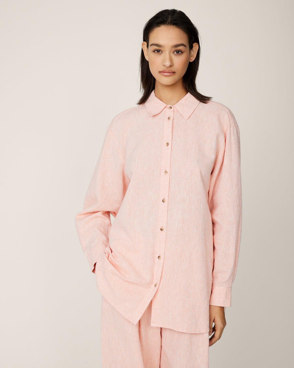 Linen shirt in a beautiful light pink colour. This classic shirt has a collar, long wide sleeves, and a button closure at the front. Style it with matching pants or skirts.