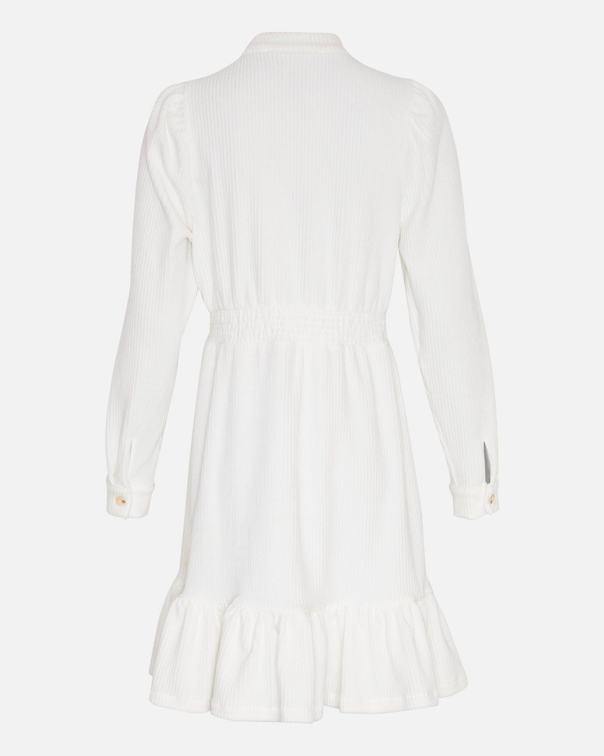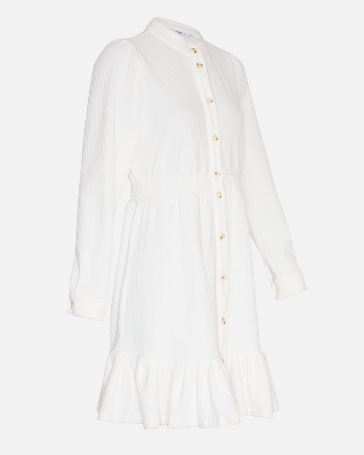 Long sleeve courduroy dress featuring button closure, frill details at the hem landing just below knee. Smock waist detail slims the waistline and shoulder gatherings make a pretty silhouette.