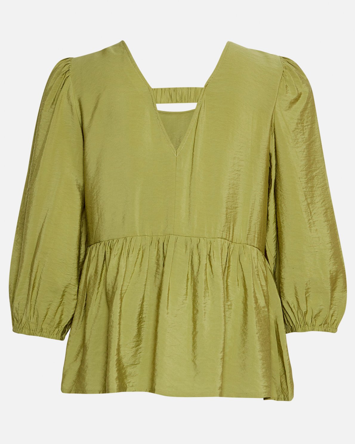Slip into this light, satin top. Lorella knows how to highlight your waist with its peplum detail. It has slightly puff, 3/4-length sleeves, mock neck and a sensual cut-out on the back, revealing just enough skin. Dress it up with matching wide pants, but your favourite pair of jeans will also do.