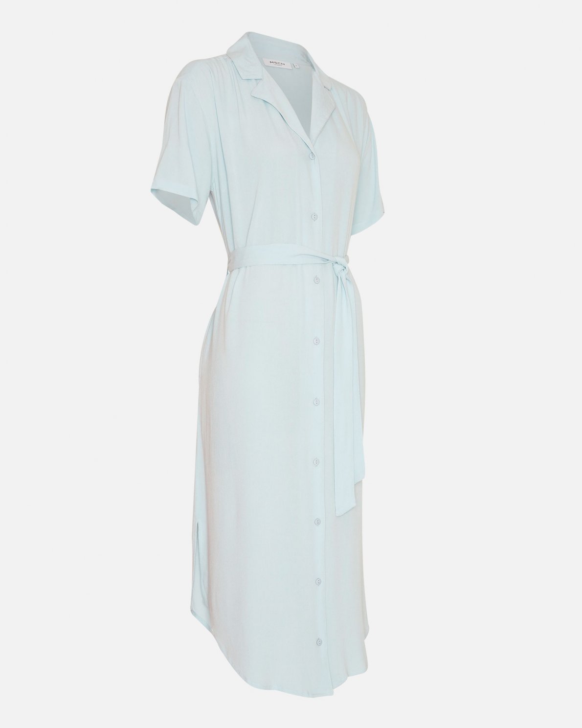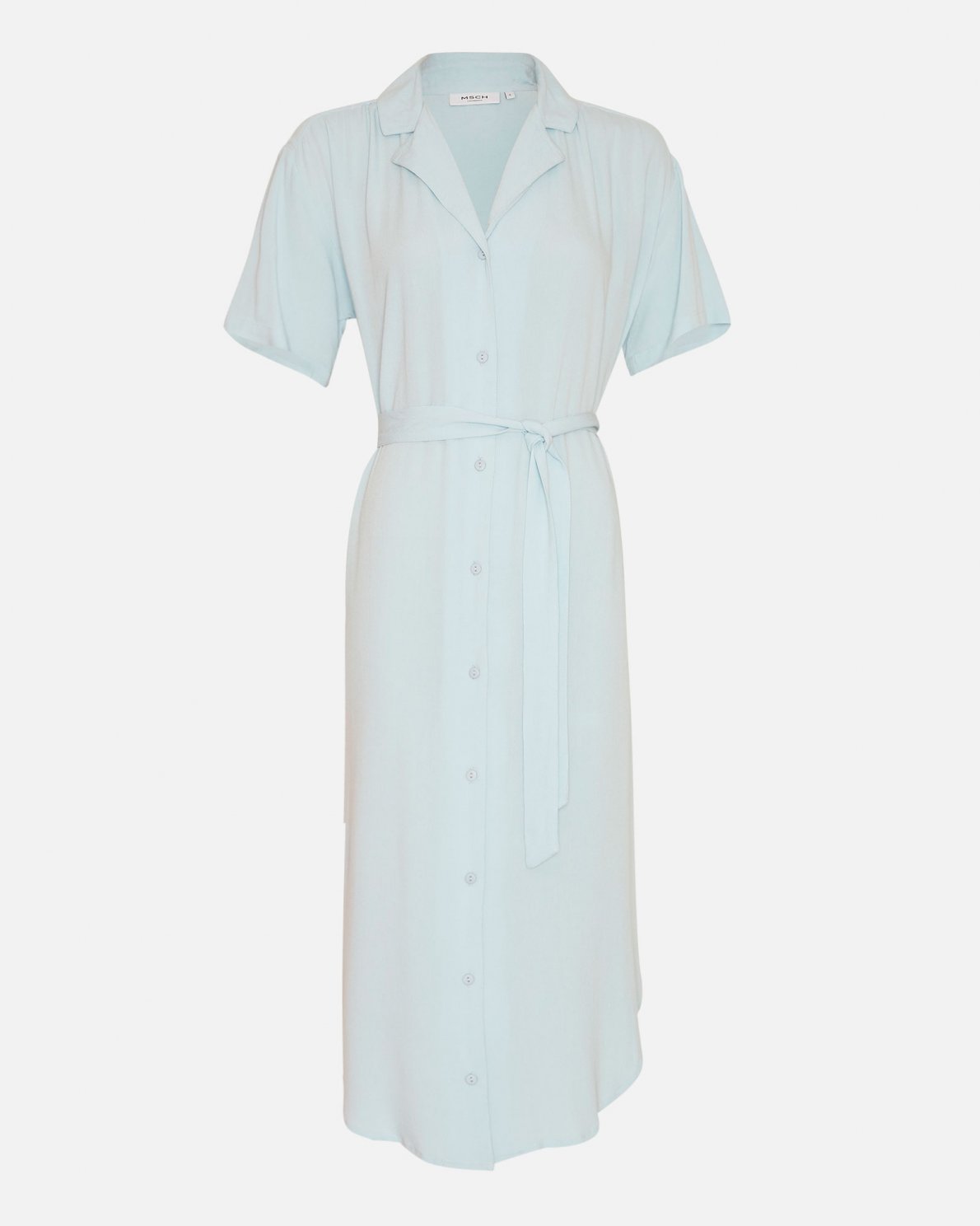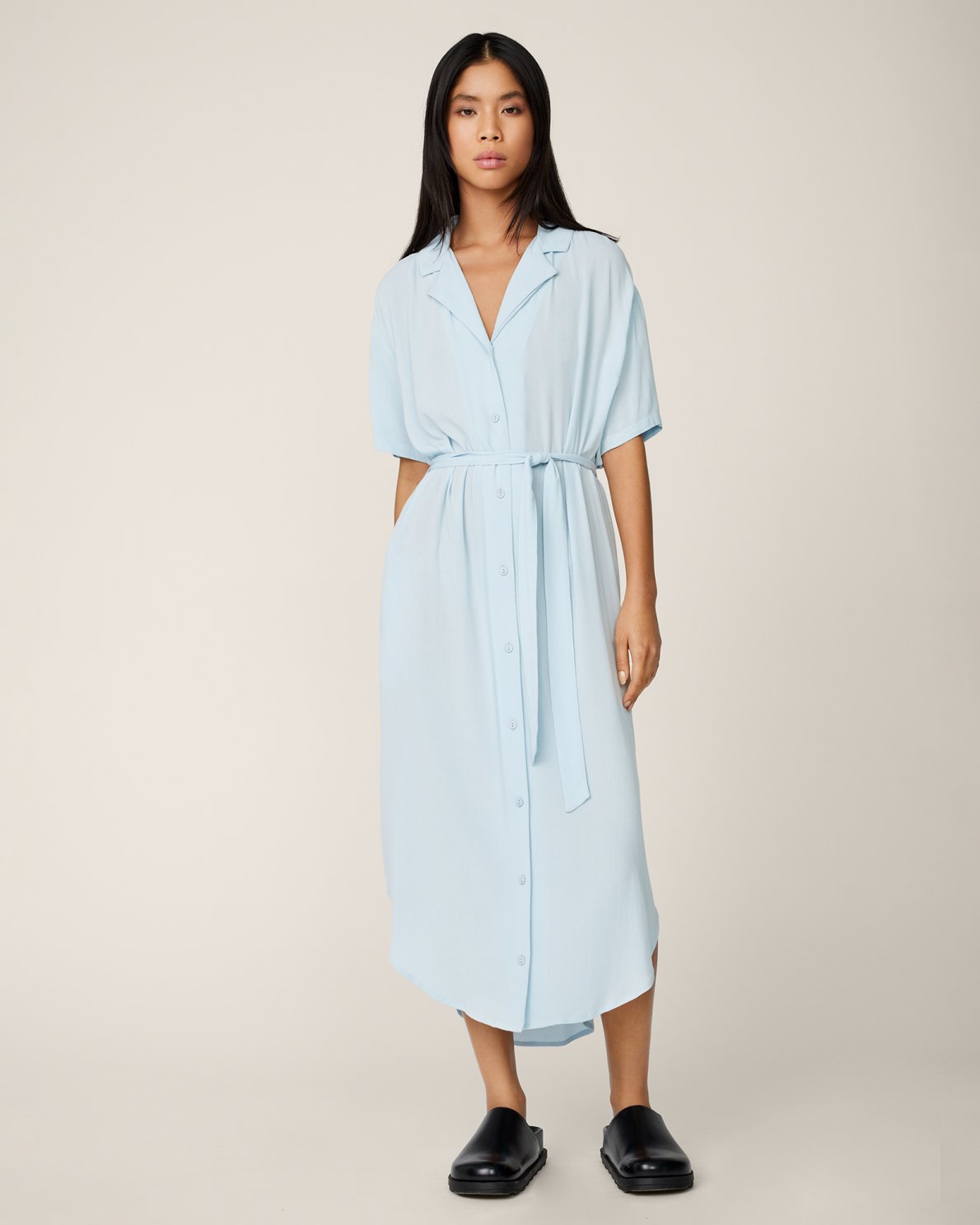Button-up midi shirt dress for effortless elegance. It features short sleeves, tie waitsband, slits on the sides, and is made of a super soft fiber in a heavenly blue colour.