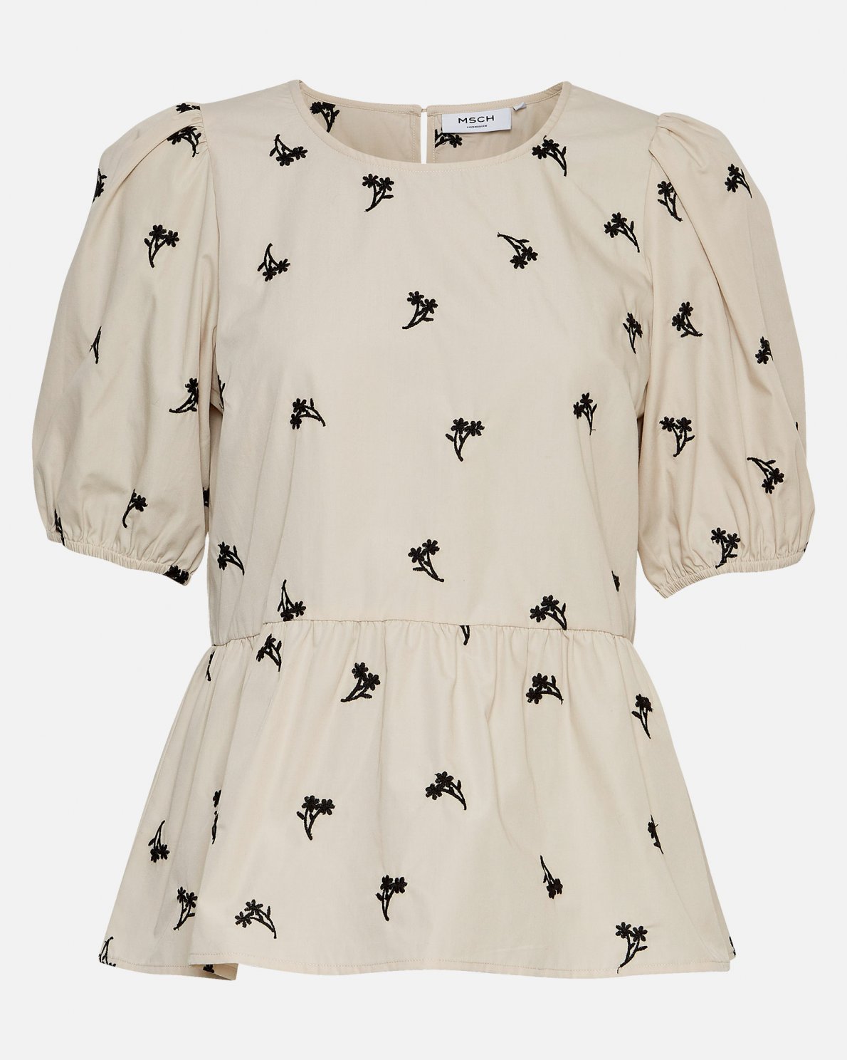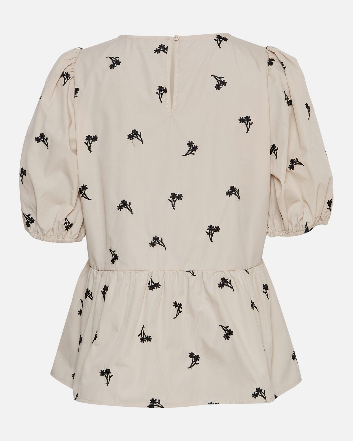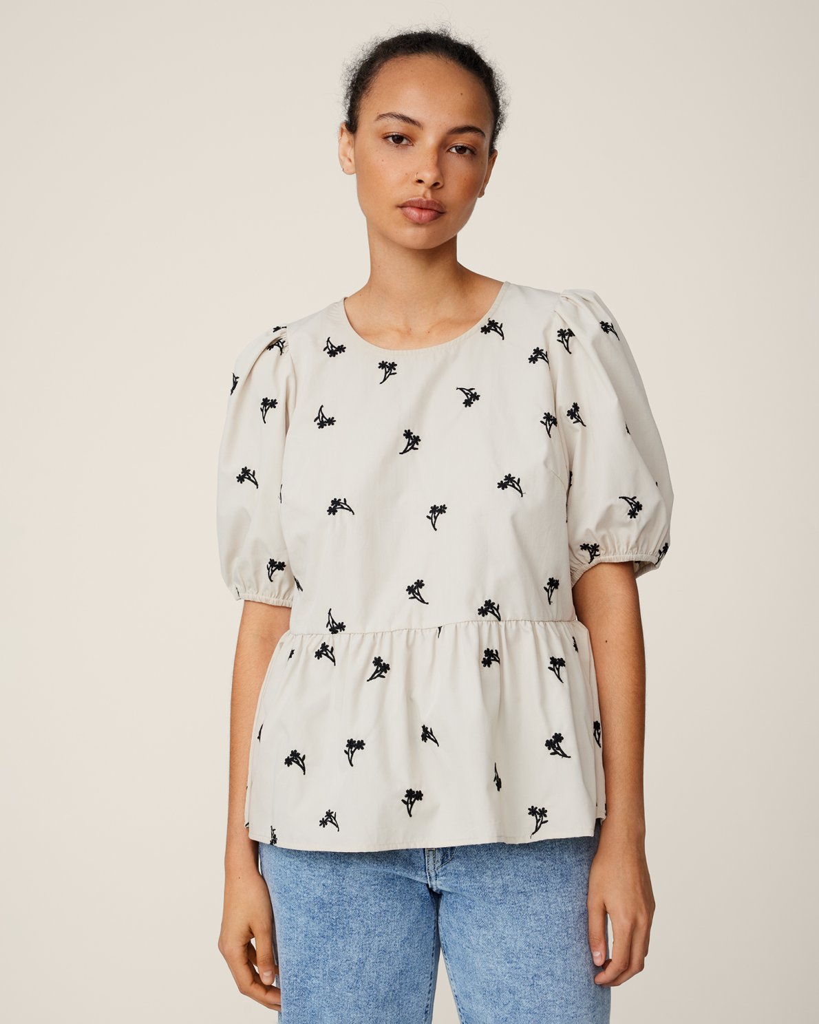 Romantic little top with embroidery details. Nannie highlights your curves just at the right places: cutline at the waistline and puffy, short sleeves making gorgeous shoulders. Pair with Lorella pants for an elegant look or a pair of jeans for a laid-back attire.