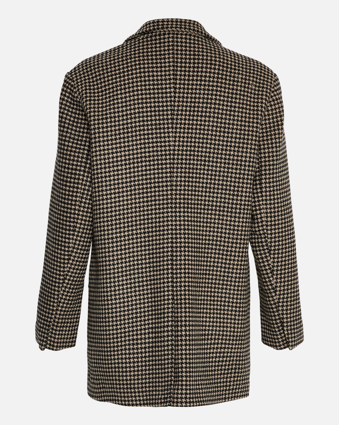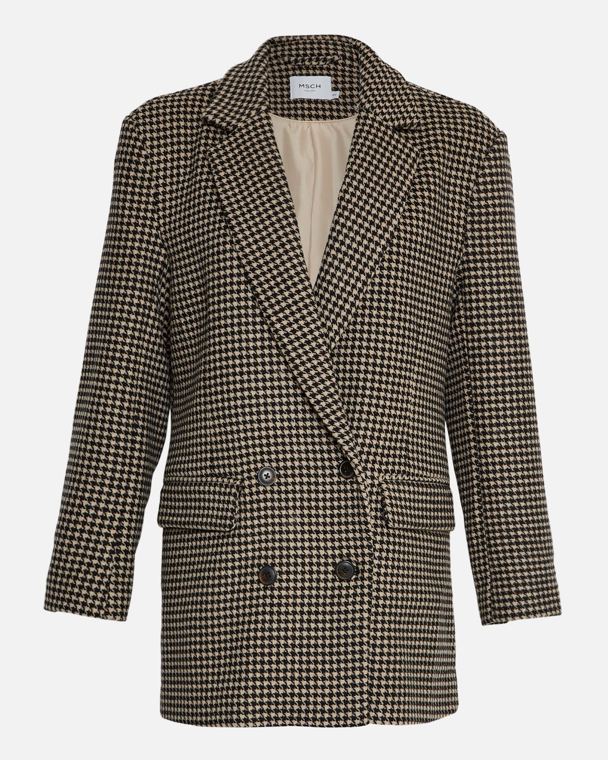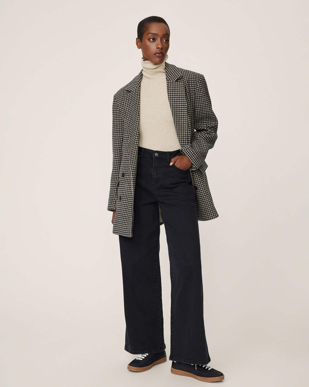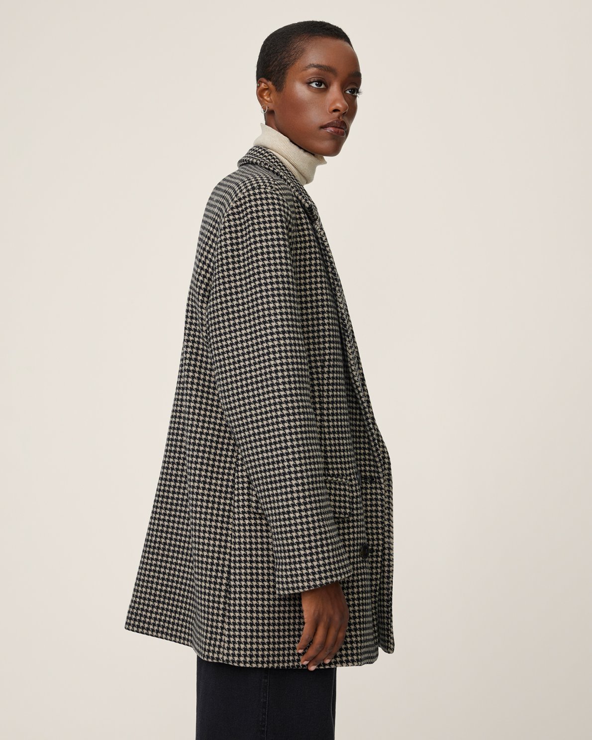 This blazer combines chic and feminine design while keeping responsible fashion in mind. Made from high-quality recycled wool, this double-breasted blazer offers a soft and comfortable feel while expressing contemporary elegance. The classic check patterns add a touch of timeless charm, making it a fashion statement for any ensamble. Whether wearing it as an extra layer for a chilly day, or dressing up an office outfit for a business meeting, this blazer will elevate your style while reflecting a responsible choice. Pair with a cozy knit and your favourite jeans for a laid-back look, or a short black dress for a special event.
