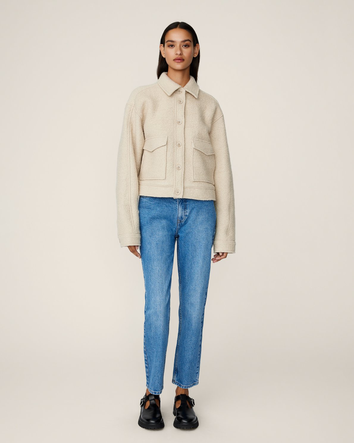 The ultimate comfort and style for the chilly days is presented by our Rienna jacket. Crafted with a teddy and boucle fabric, it is incredibly soft and cozy, ensuring a luxurious wearing experience. The short length adds a touch of flair, making it a perfect layering piece over your favourite outfits. It features practical front pockets, button closure with a stitching detail that adds a unique visual. Whether going for a casual outfit, or a dress-up occasion, this boucle jacket is a statement piece for a fashion-forward wardrobe.
