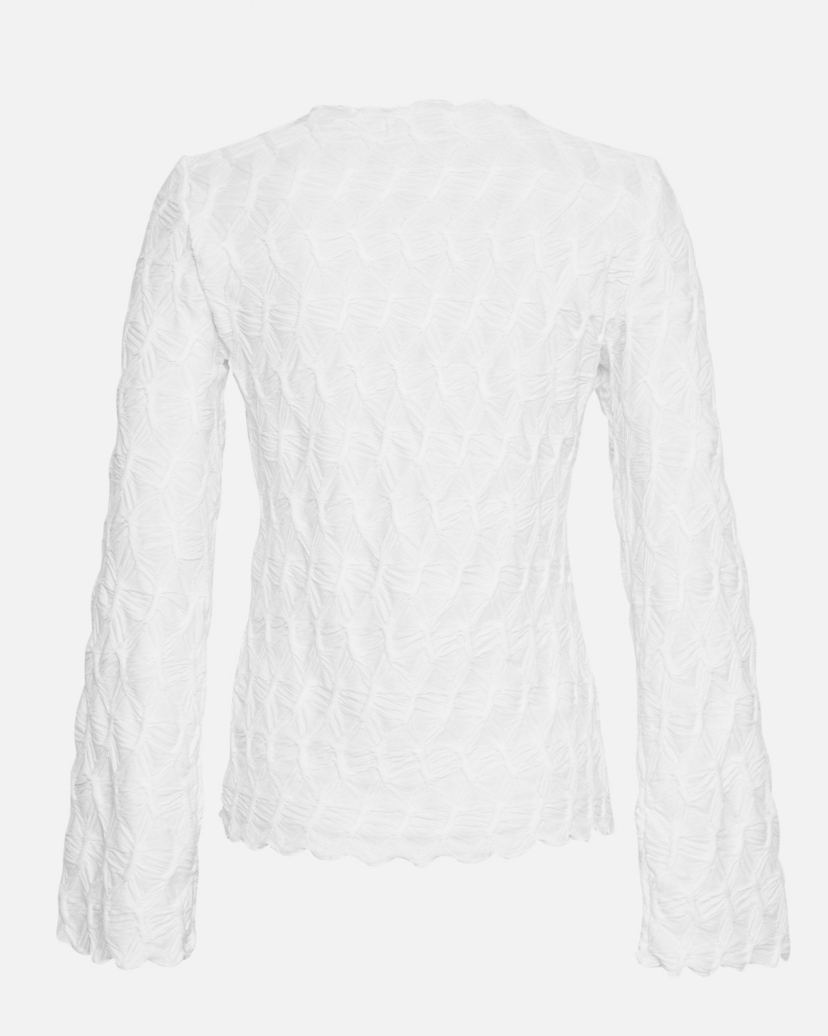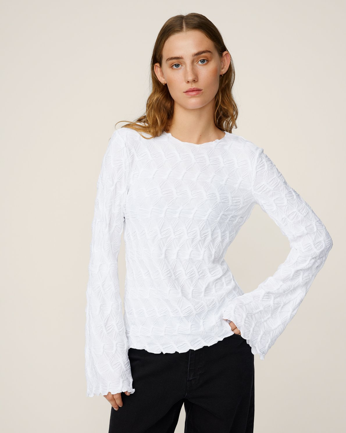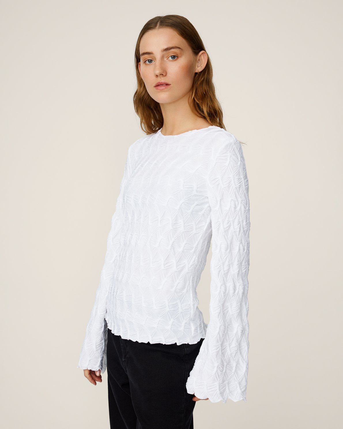 Karessa offers both comfort and fashion for the modern individual. This long sleeved top features a boat neck, gracefully framing your collarbone and shoulders, while offering an understated elegance. The wide sleeves add a fashion-forward element, highlighting the combination of the feminine and chic design. The material structure offers a unique visual, making it the ideal choice for any occasion. Whether pair it with jeans or a chic mini skirt, this top will make a statement and elevate your outfit.