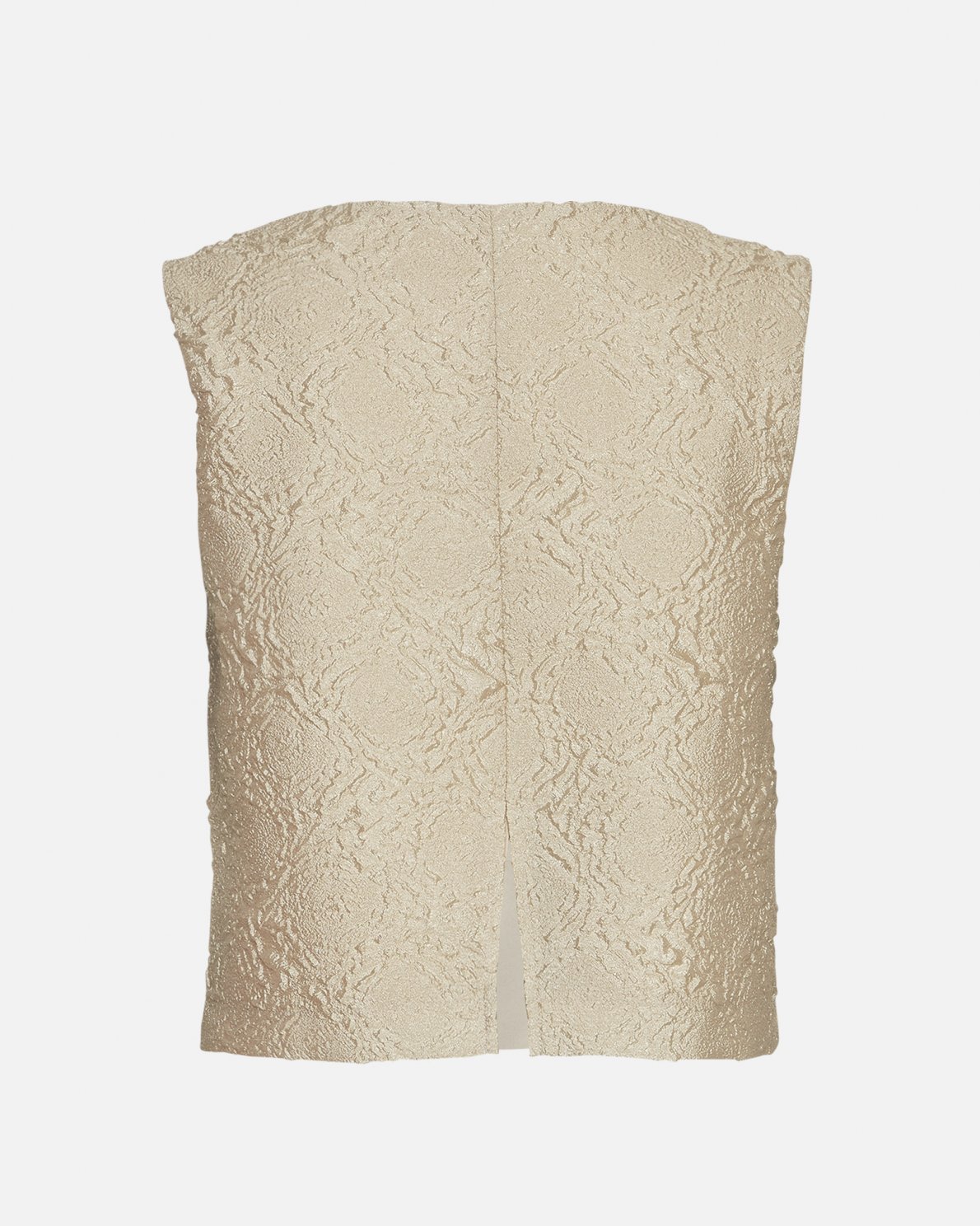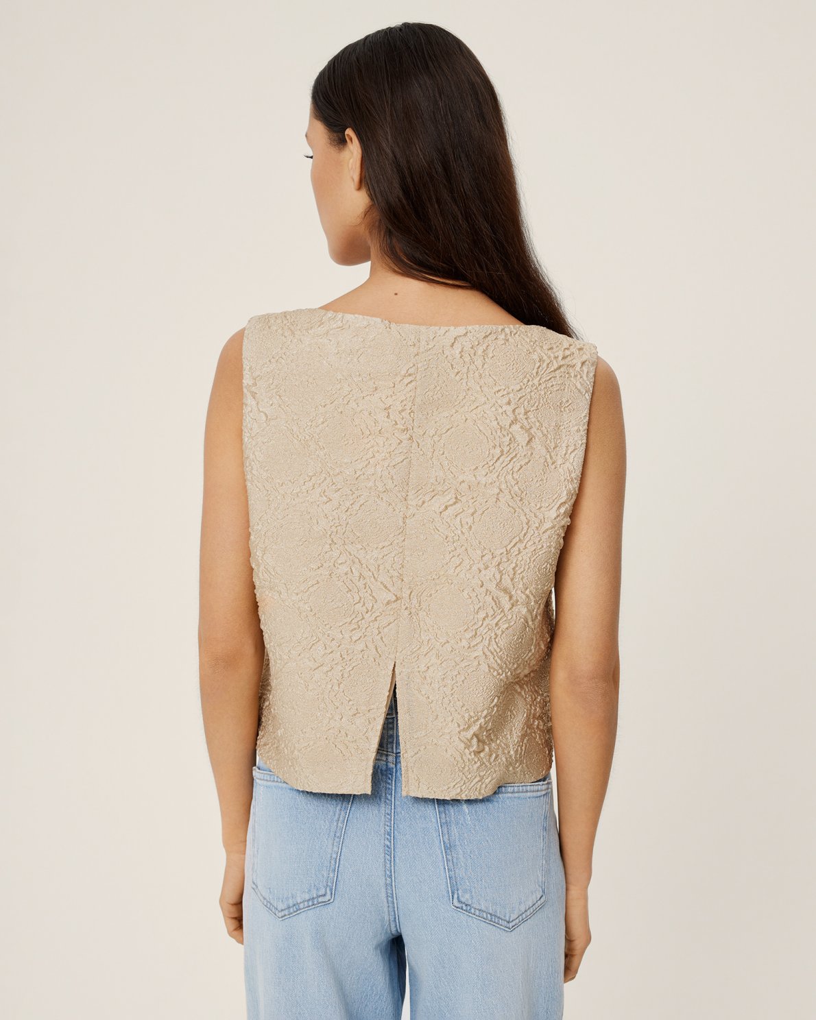 Aldis is a thick structured material, that gives a very luxurious feeling. The top features a cropped fit, with a small slit in the back. Style it with the skirt for a full matching set, or wear it with either jeans or suit pants.