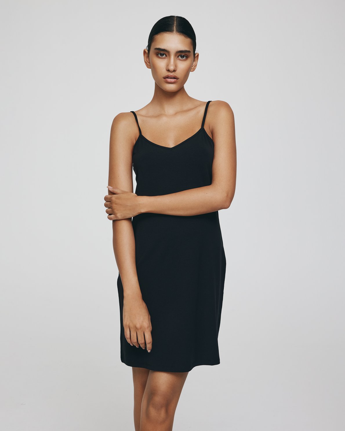 Unsere neue Basic-Kollektion Betrina, umfasst Shorts, ein Trägertop und dieses Trägerkleid. Durch die weiche Lyocellmischung ist das Material sehr atmungsaktiv und nimmt Feuchtigkeit gut auf. Es besitzt verstellbare Träger und ein kurzes Design. Dank seiner robusten Faserstruktur liegt es sehr glatt und seidig auf der Haut und begleitet Sie Saison für Saison.