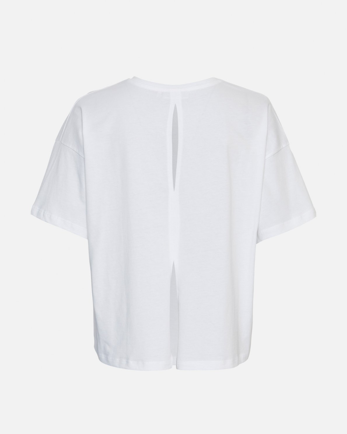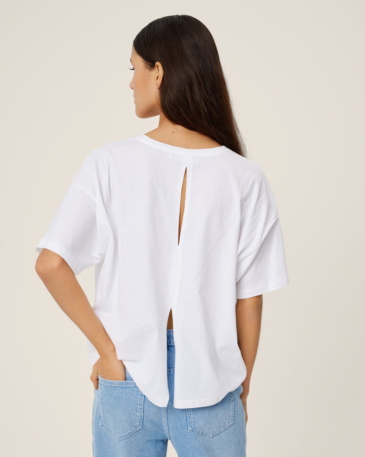 Made of organic cotton, this T-shirt comes in a loose fitted design, round neckline and a cut-out detail on the back which makes this basic tee to a statement piece. Style with your favorite jeans or summer shorts.
