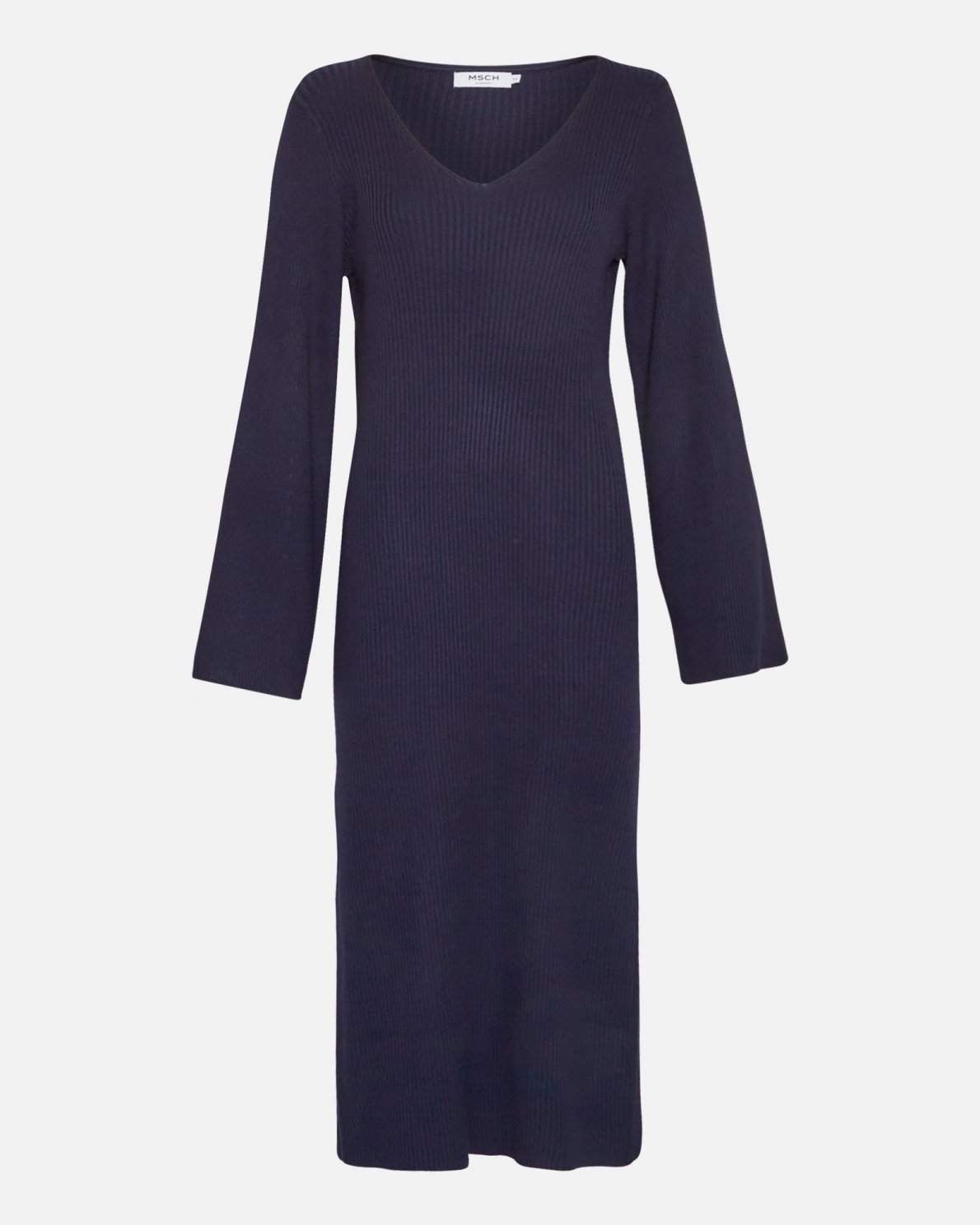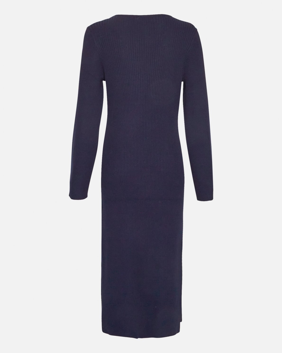 This dress is finely crafted with attention to detail. It's a knitted dress with a feminine touch, with the wide V-neck and slit. For a more winter feel, style it with a grey roll neck top, black tights and boots.