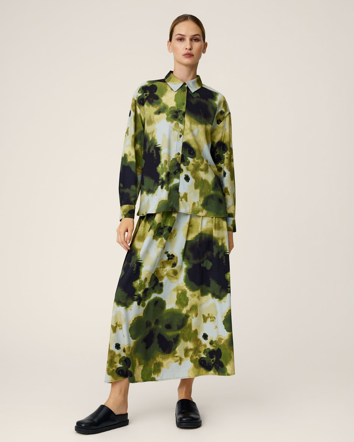 This skirt has a regular fit. The model is 177cm and wears a size S.