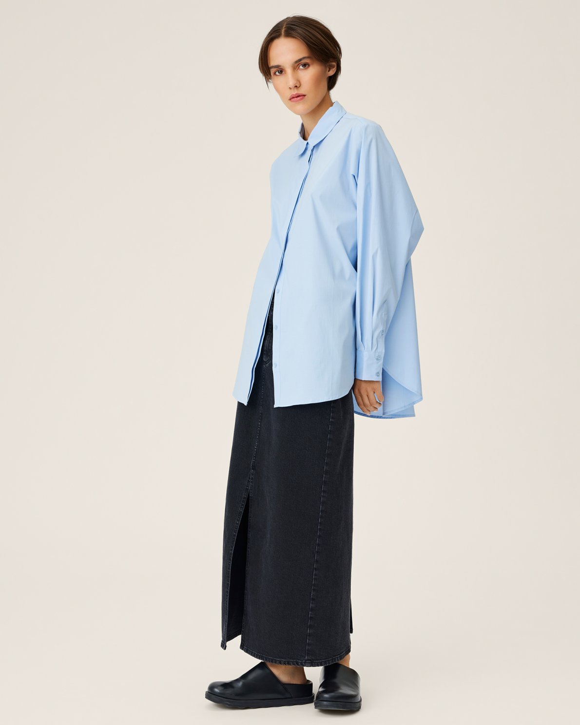 The Danetta shirt is a contemporary and relaxed garment designed for both comfort and style. This shirt is characterized by its boxy silhouette, offering a loose and laid-back fit that provides ample room for ease of movement. The design features a classic collar, a button-up front, and cuffed sleeves, contributing to its casual yet polished aesthetic. Whether worn loosely over jeans for a casual outing or tucked into tailored trousers for a more refined ensemble, the "Danetta" embodies a contemporary approach to classic styling.