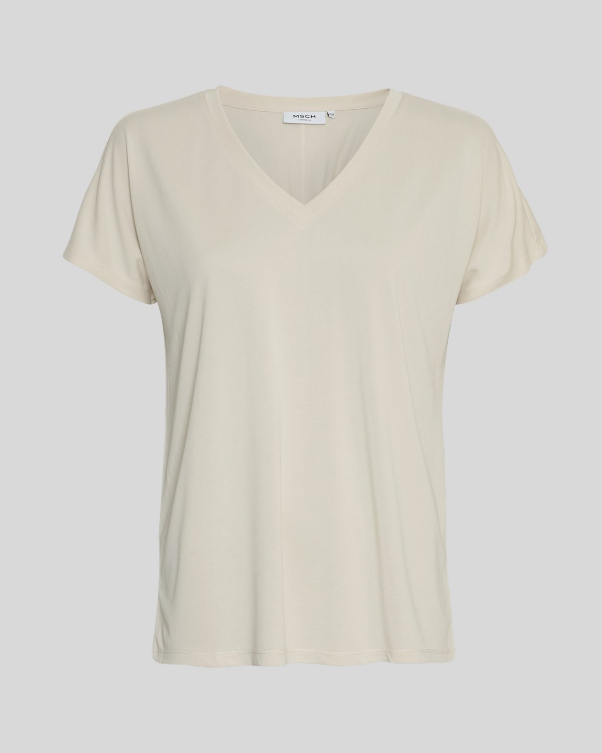 Ein absoluter MSCH-Favorit, jetzt mit V-Ausschnitt und kurzen Ärmeln. Es besteht aus superweichem, sandgewaschenem Modalstoff und sorgt für ein besonders angenehmes Tragegefühl. Es passt zu allem: Jeans, Hose mit entspannter Passform oder einem stilvollen Rock. Ein Oversize Blazer wertet dieses schlichte T-Shirt stilvoll auf.