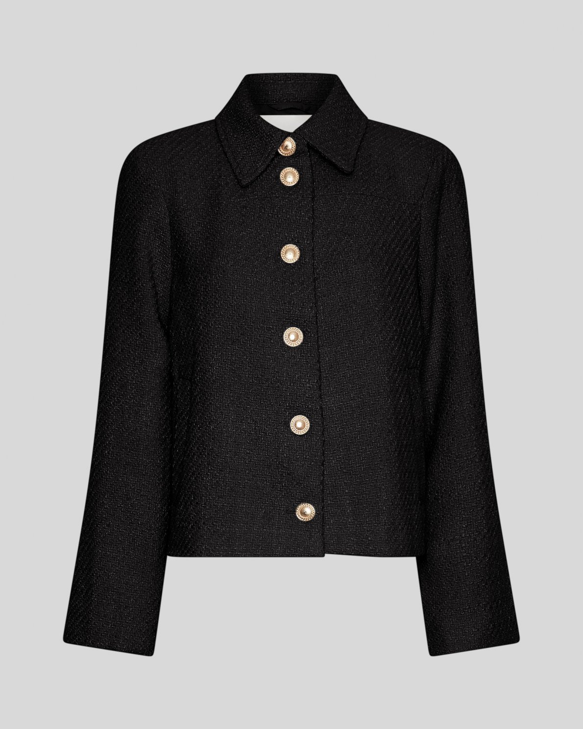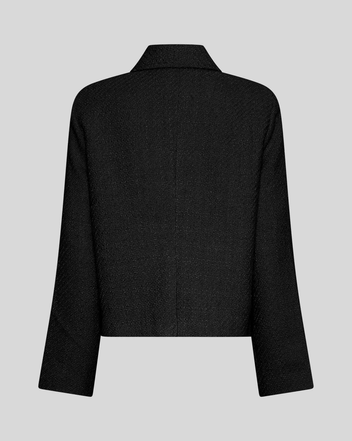 Abriella is the perfect short jacket that will be your best companion for any occasion. It features a shoulder padded design, beautiful statement buttons on the front, side pockets and loose sleeves. It is crafted of the finest boucle fabric that adds timeless sophistication to your attire. The loose, relaxed fit provides maximum comfort and casualty to your silhouette. It comes in a classic black color to ensure that your chic outit will stay out of the crowd and you can embrace your individuality. Pair it with matching pants for a complete look for special occasions, or simply wear it with your favorite MSCH jeans for a laid-back look.