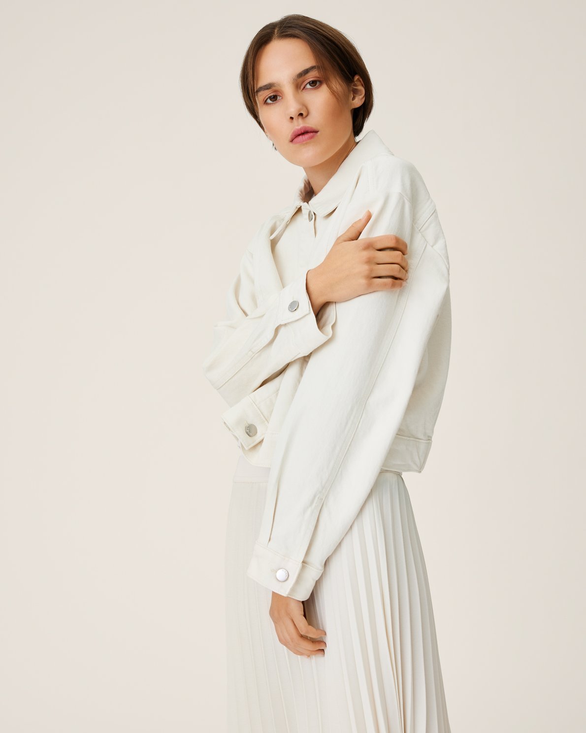 The denim jacket is designed for both fashion and functionality, featuring side pockets that do not only add a touch of utility but also enhances its chic look. It is a perfect addition to a fashion-forward wardrobe and an ideal choice as a layering piece for any season. With its chic button-up design and gathering details at the back, this jacket compliments a range of outfits. Pair it with jeans, a long skirt, or layer it over a feminine dress for a casual yet stylish ensemble.