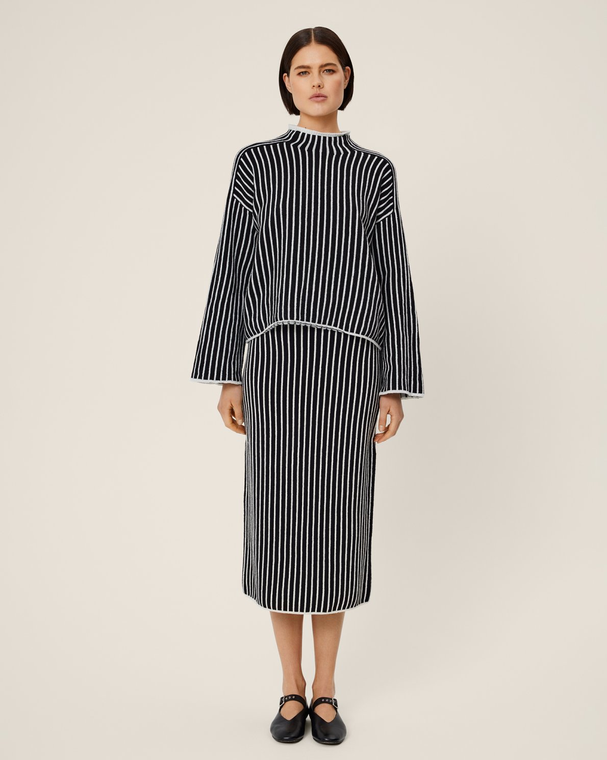 This skirt has a slim fit. The model is 183cm and wears a S/M.