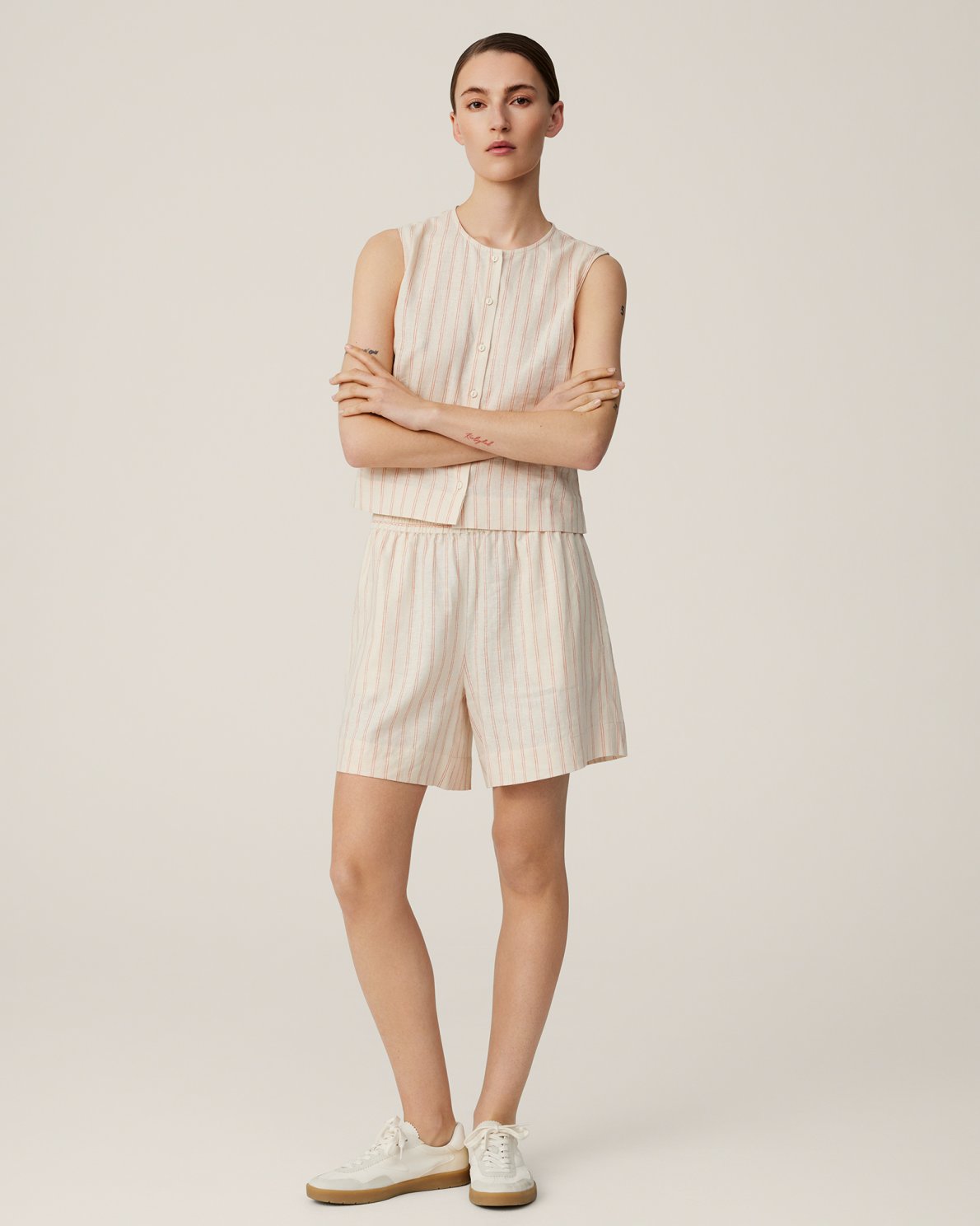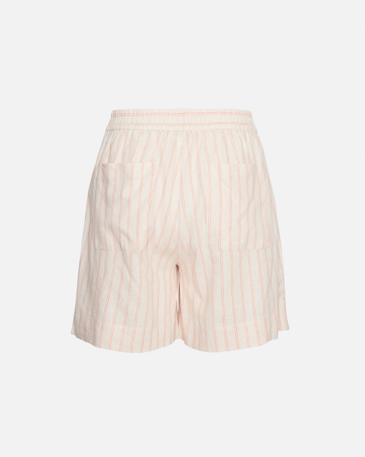 The linen obsession continues with our new Conella series. You'll find a strap dress, a top, a pair of pants and these shorts. They all have the subtle orange stripes on a beige linen background. The shorts feature an elastic waist and above the knee length. It's easily matched with different colours and silhouettes if you want to opt for something different than the matching set.