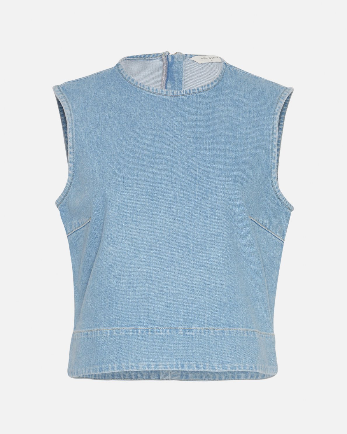 Our Inan dneim top features a sleeveless design, stitching details and a zipper in the back. The modern combination of the beloved denim trend with a top instead of a skirt or jeans. Style it with either the matching Inan skirt, or a pair of jeans, either in light blue or a contrast colour.