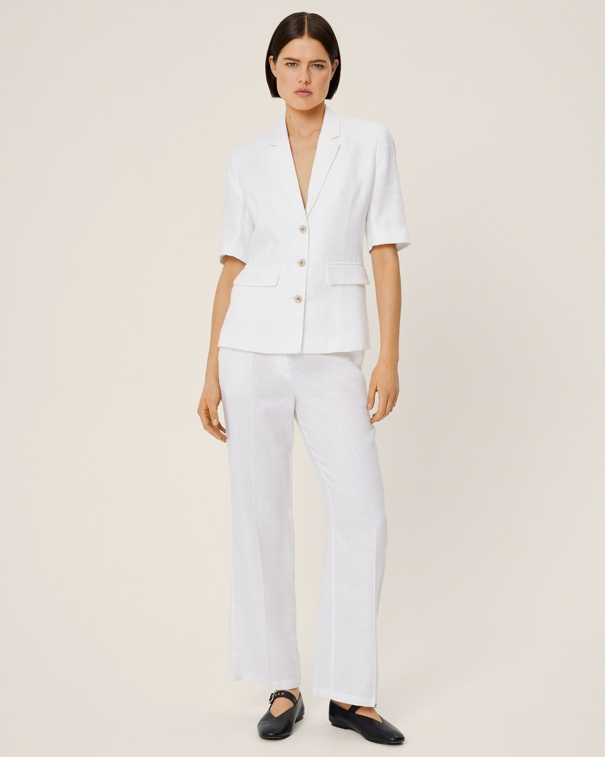 Tailored wide-fit linen pants with press fold, side pockets, contrast stitching detail and belt straps. Select a matching linen style to complete your look, or tone it down with a basic white tee for some simplicity.