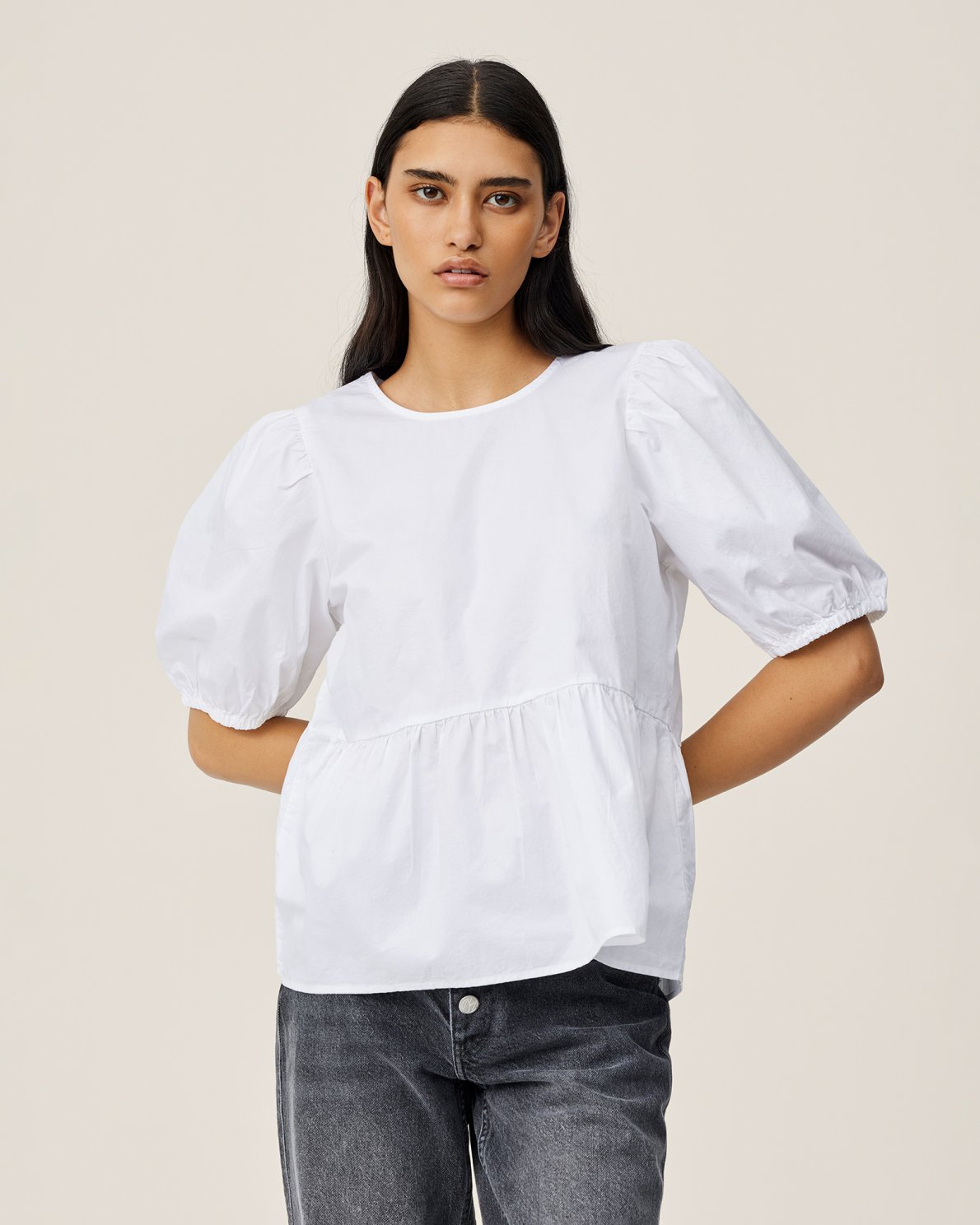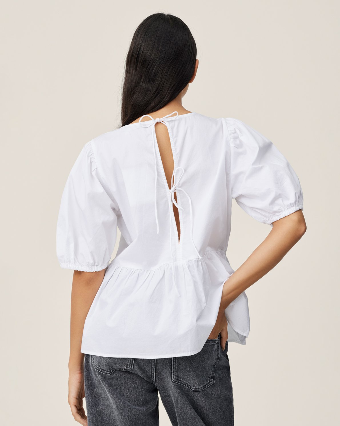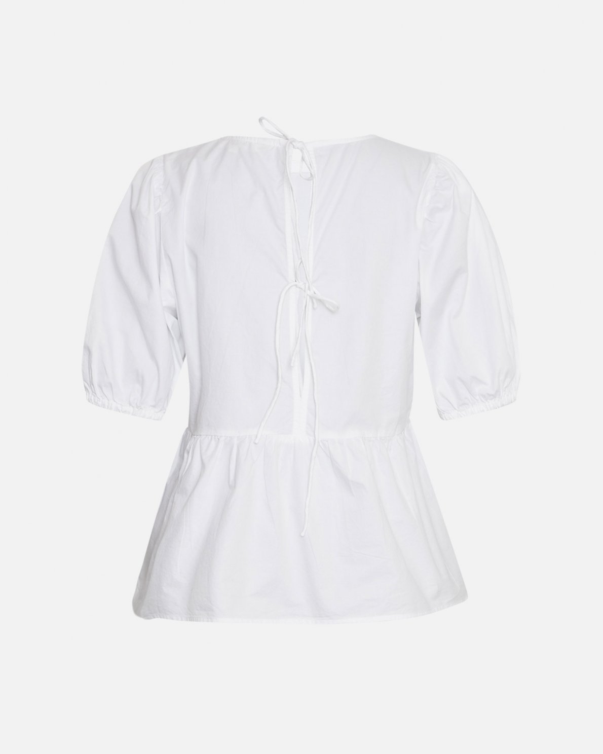 Kuana is a poplin feeling top that features 2/4 puff sleeves, strings to tie on the back and a peplum style. The top radiates classisc, timeless and femininity. Pair it with a pair of jeans for that ideal contrast between classic and cool or with a pair of suit pants to enhance the formal feel.