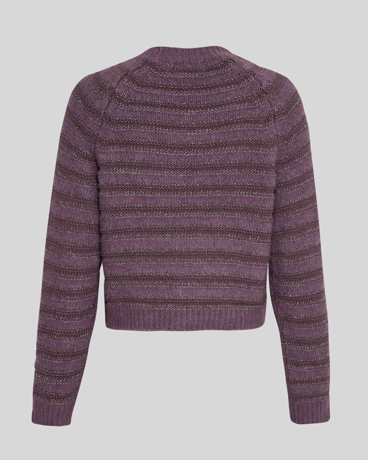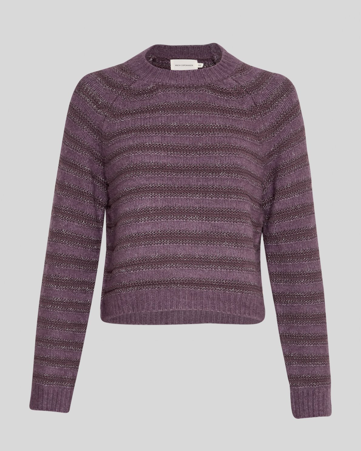 Ardella is a finely knitted pullover with stripes of bordeaux and purple mixed with a small glitter stitching. The pullover has a classic riund neck, long sleeves and a regular fit. Style it with either skirt or trousers, it can be worn with everything.