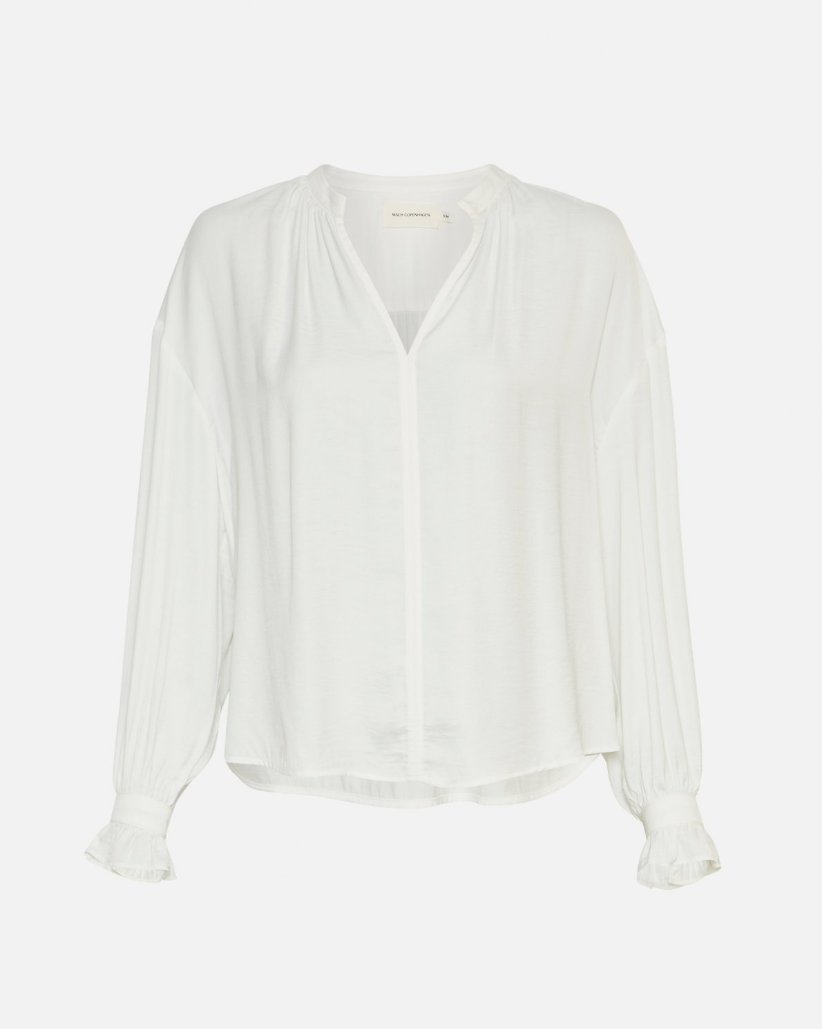 The Minara Malcua Top is a very staple style here at MSCH COPENHAGEN, it has our signature Recycled Polyester and Viscose fibers, creating a polysilk look to the top. The top features an elastic cuff and a soft V-neckline.