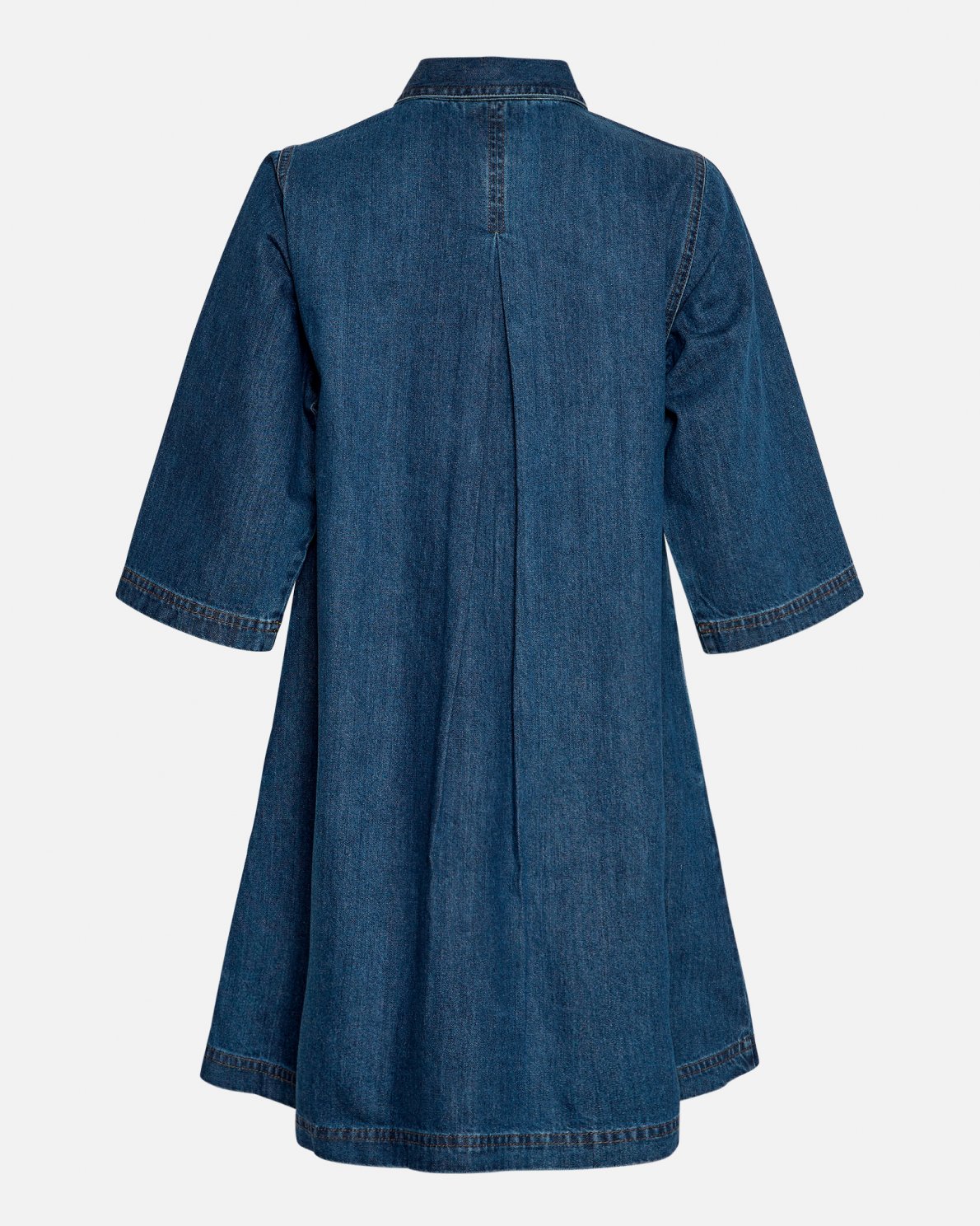 This A-shaped denim dress has a loose fit and all the detail inspired from a shirt. The classic collar, the full placket. The dress also features short wide sleeves. It's a modern, cool twist to a never ending denim trend.