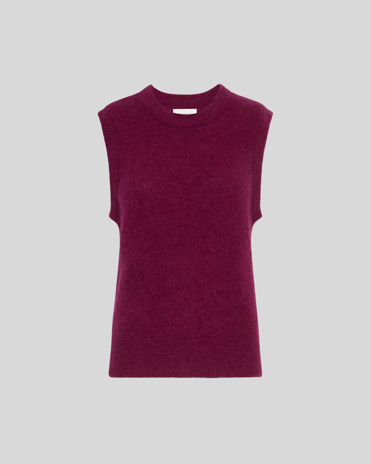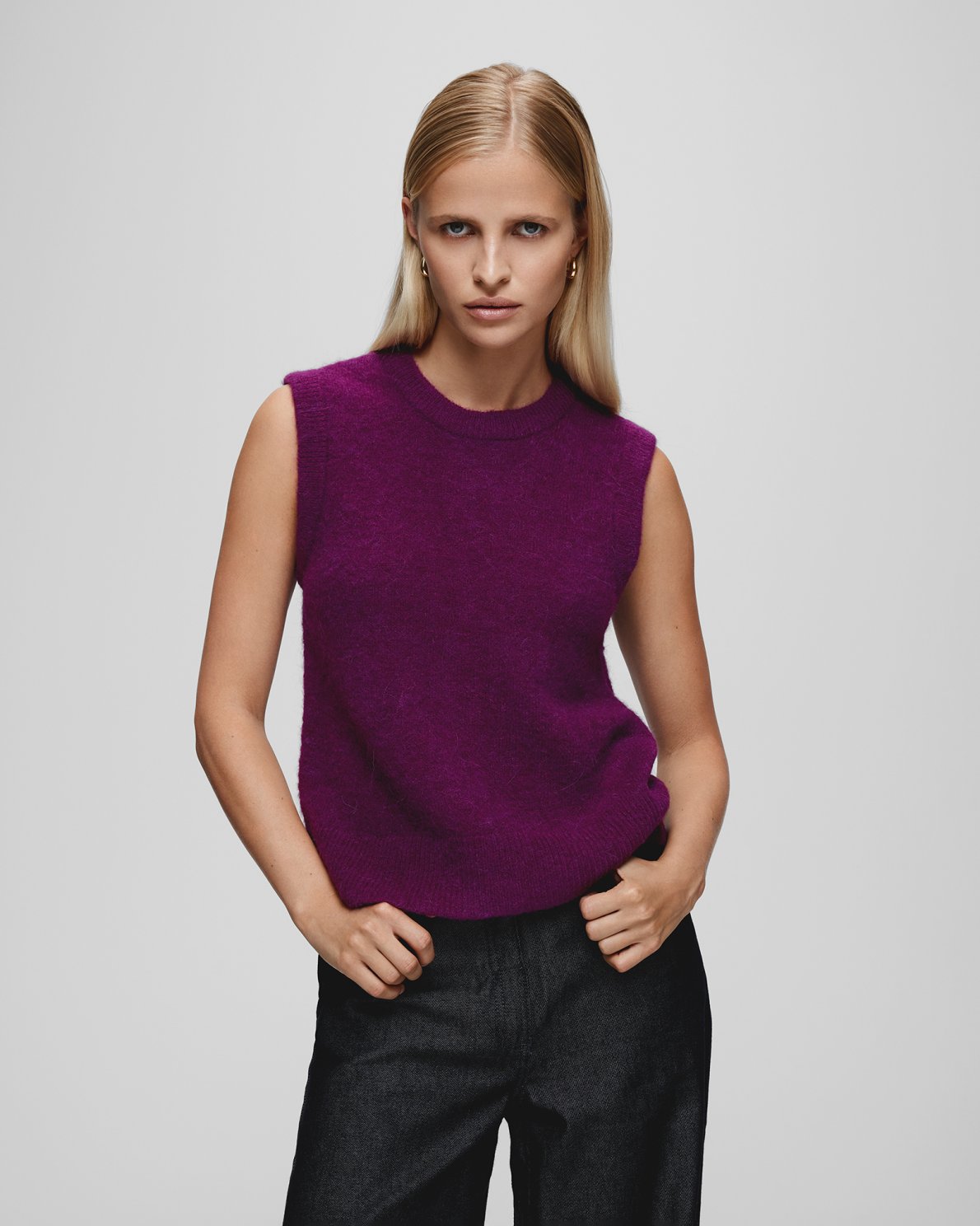 A classic knitted vest is coming back in trend. It's the stunning combination of simplicity, genderless, knitwear. This vest features an elegant regular fit, with a round neck, and ribbed egde both at neck, sleeve openinge and the bottom. Style it with both skirts and pants.