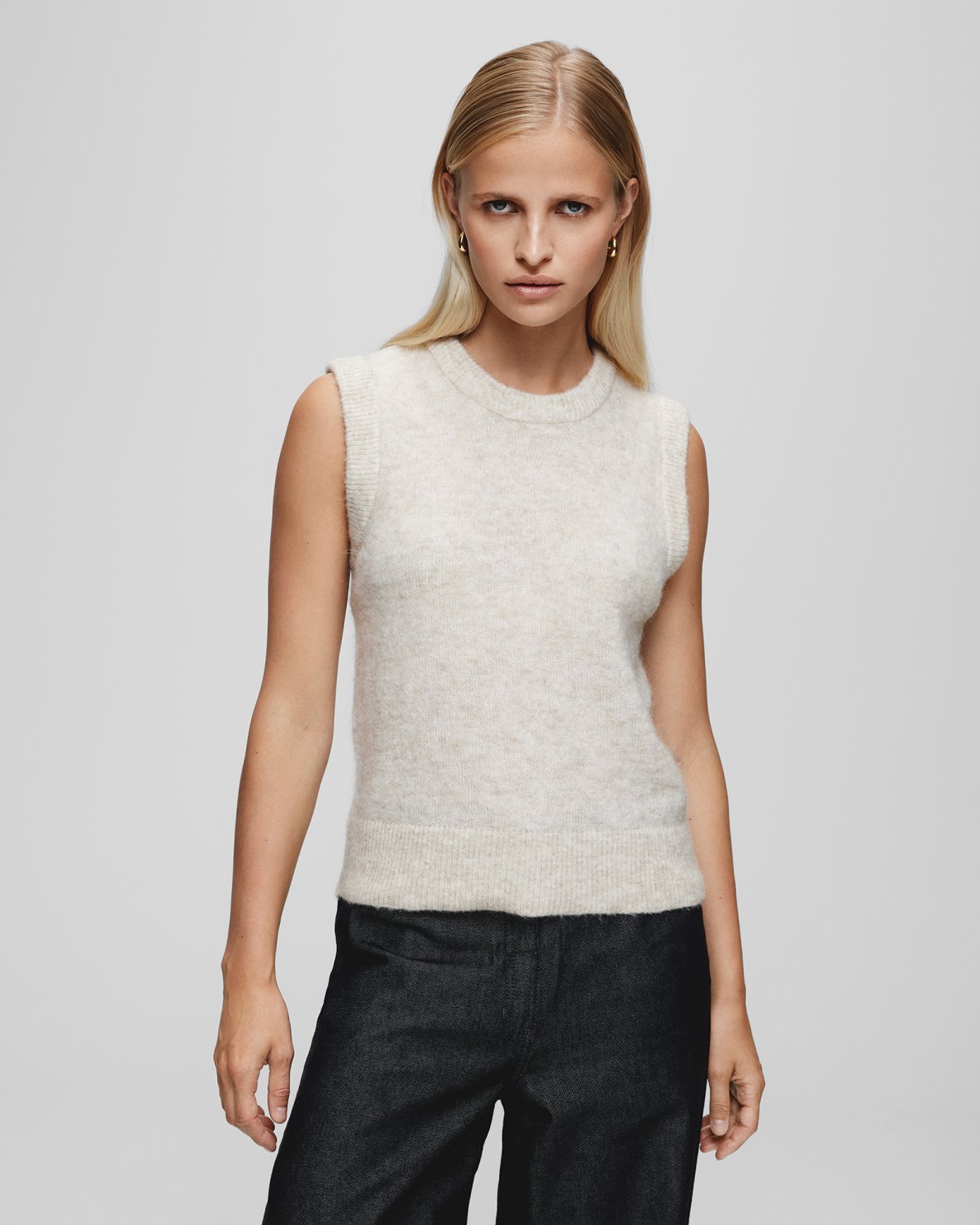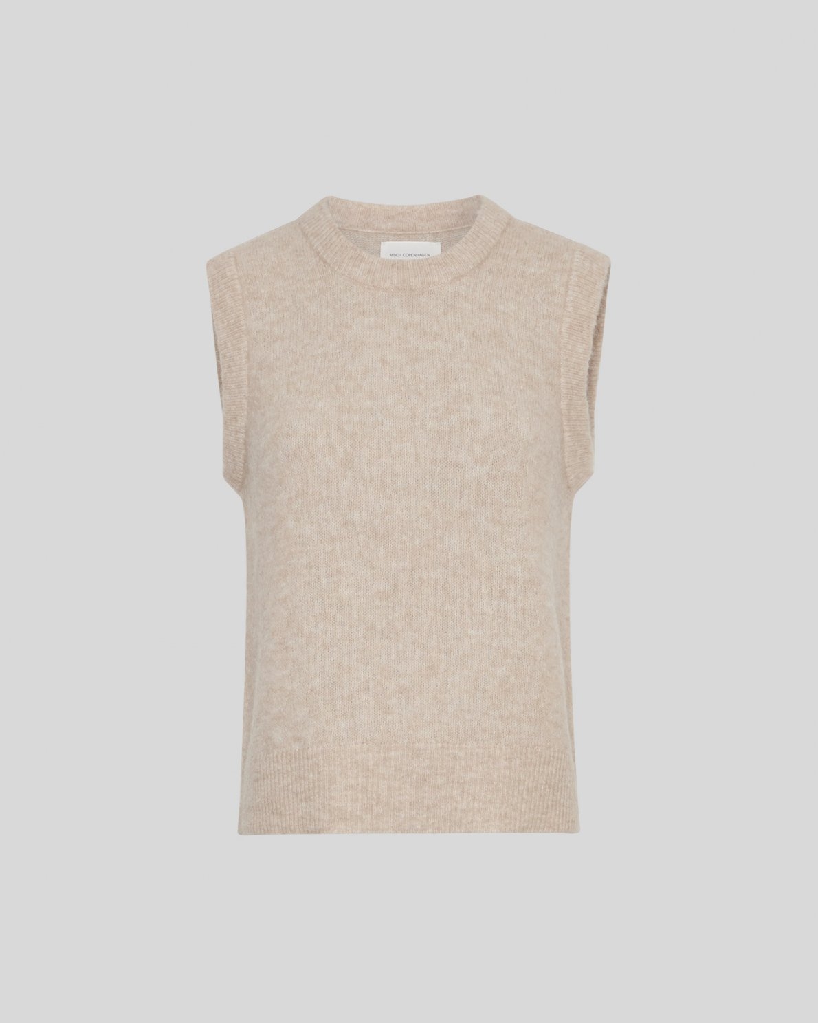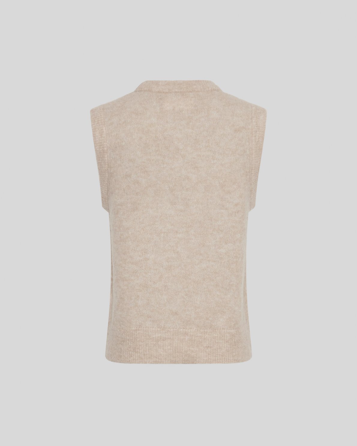 A classic knitted vest is coming back in trend. It's the stunning combination of simplicity, genderless, knitwear. This vest features an elegant regular fit, with a round neck, and ribbed egde both at neck, sleeve openinge and the bottom. Style it with both skirts and pants.