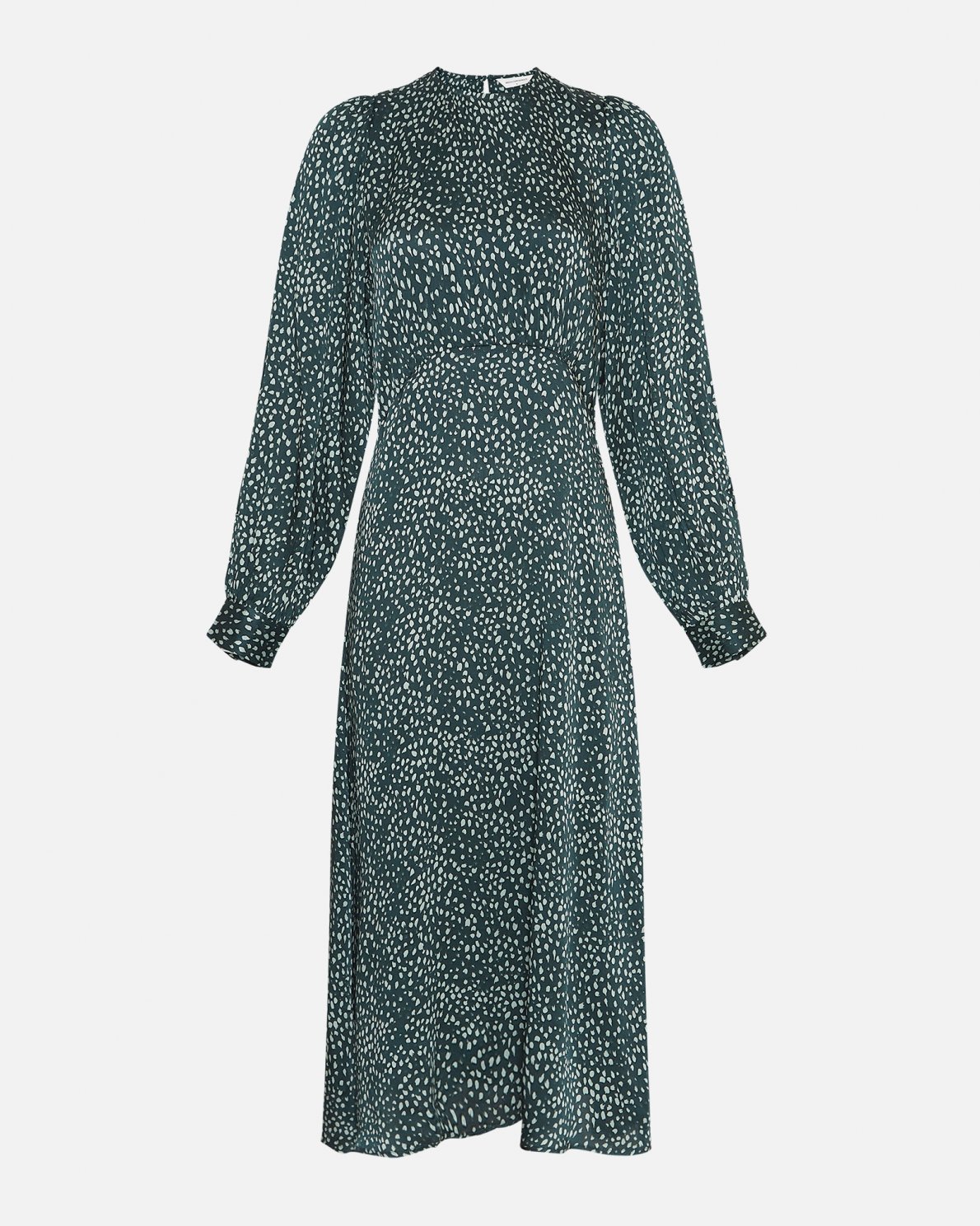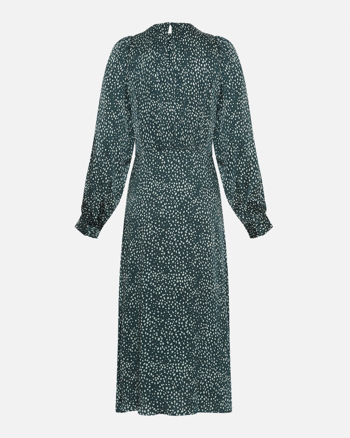 Adalaida is a long dress, in a warm pine green colour with dots all over. The dress features long sleeves, a loose skirt, but a cutline detail around the waist to enhance your figgure. The dress has a small open back deatil and button closing in the enck.