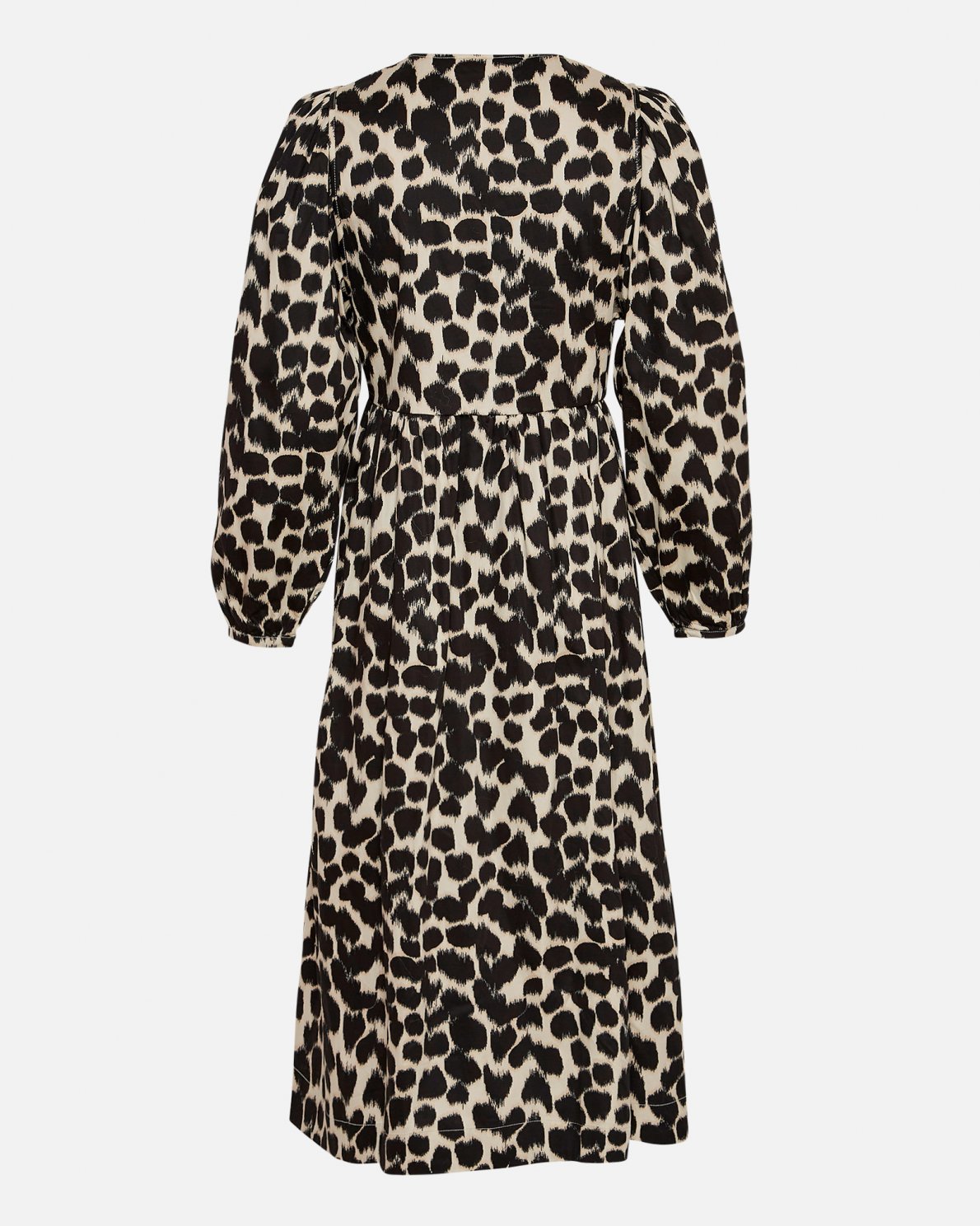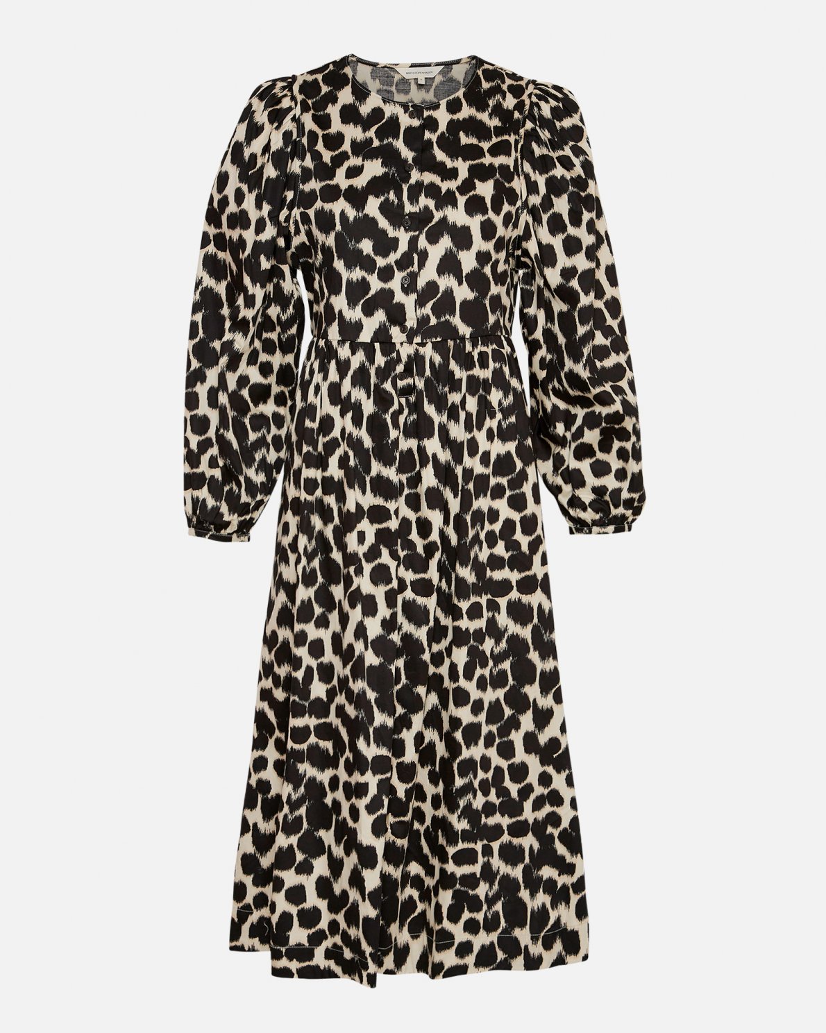 Ottelie is a beige and black leo printed material. The dress features a half placket with black buttons, a round neckline and sleeves with a small puff. The skirt of the dress is long and flowy, giving the dress a modern feel. Style it with a pullover or knitted vest on top,