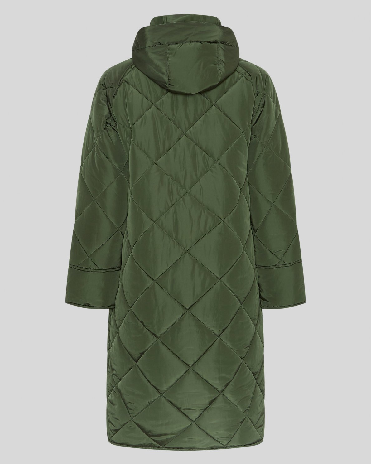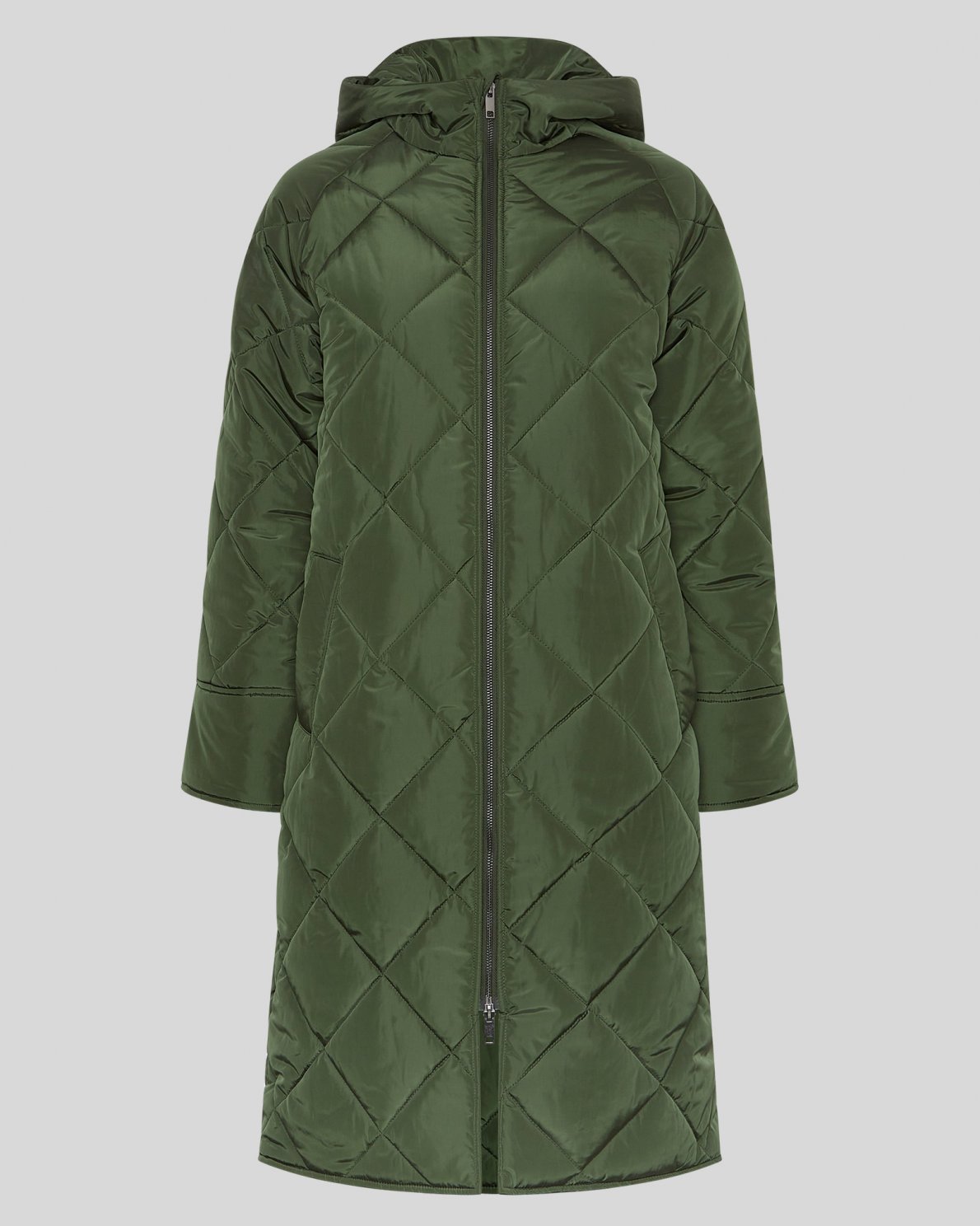 This lightly quilted jacket is the perfect season transitional jacket. It's light yet keeps you warm and is in a longline design. The jacket features a high neck and a hood, with long semi wide sleeves and a two-way zipper for closure. There is two front pockets as well.