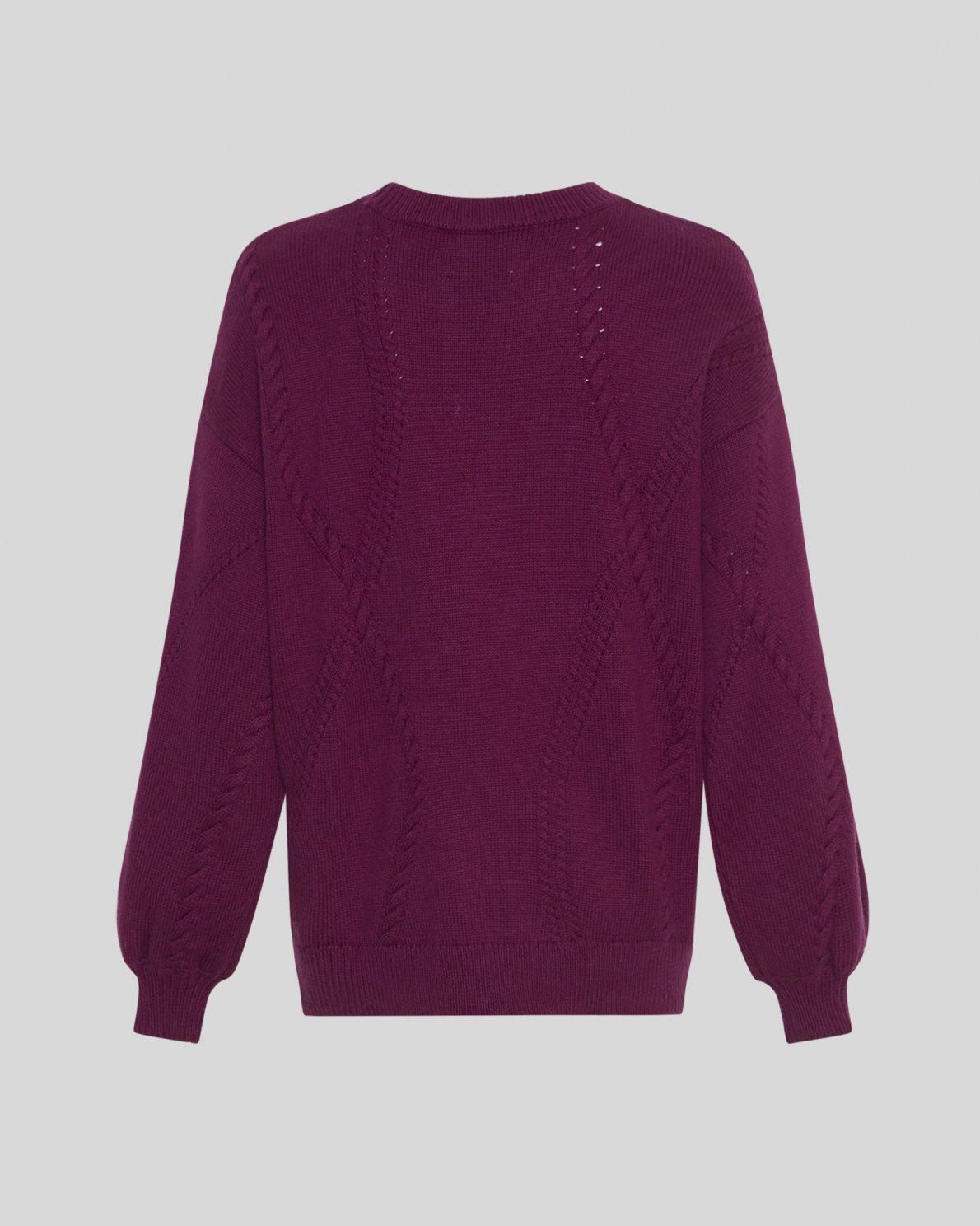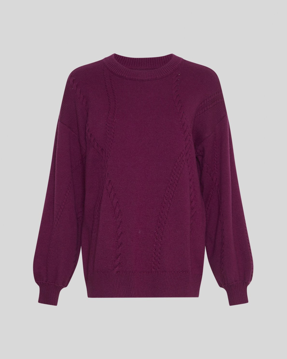 The Cecilia pullover is a statement piece. It features a catching abstract patterin the knit both on the front, the sleeves and on the back, the classic ribbed egdes at the neck, the botton and as cuffs and has big balloon sleeves with dropped shoudlers to enhance the oversized look.