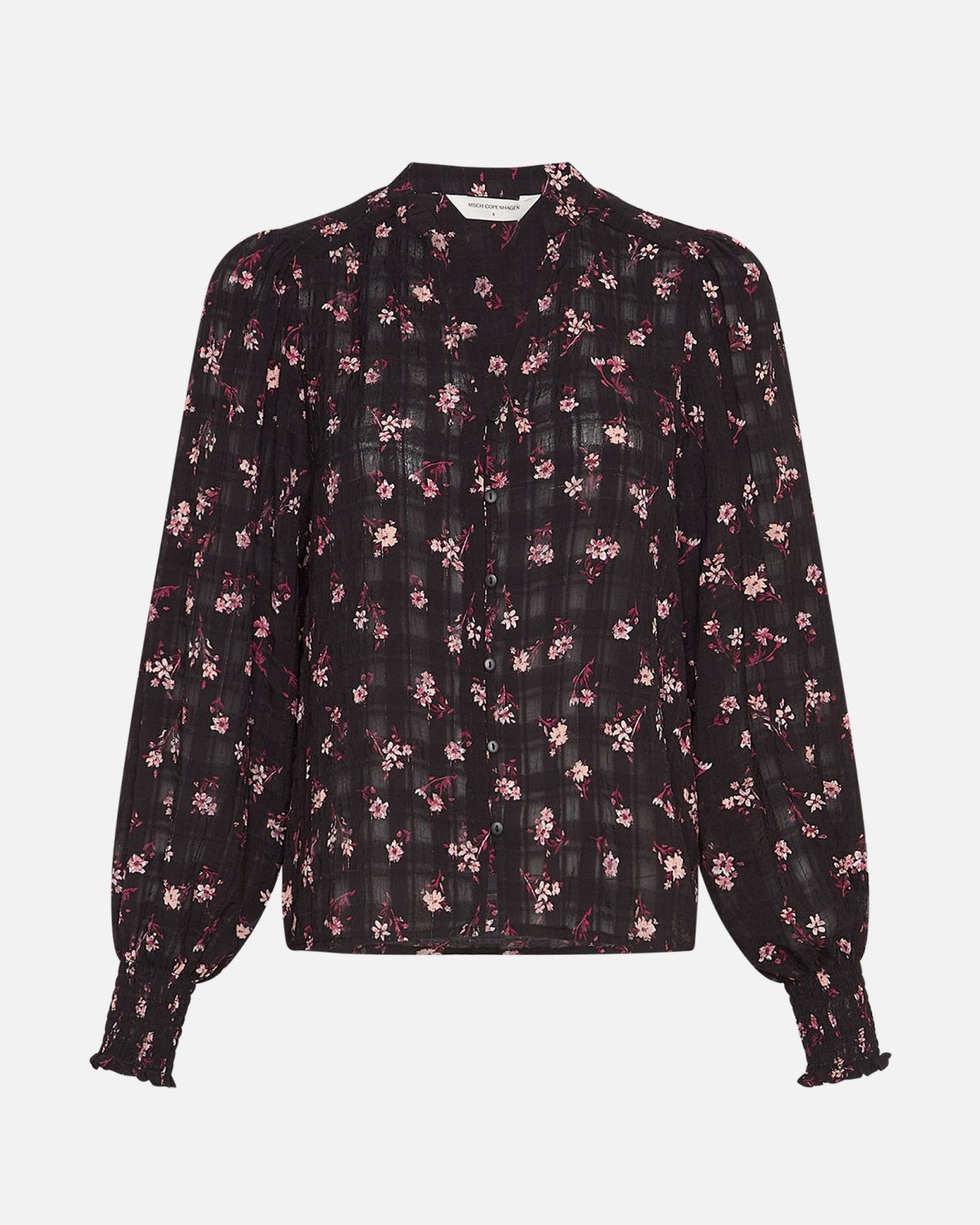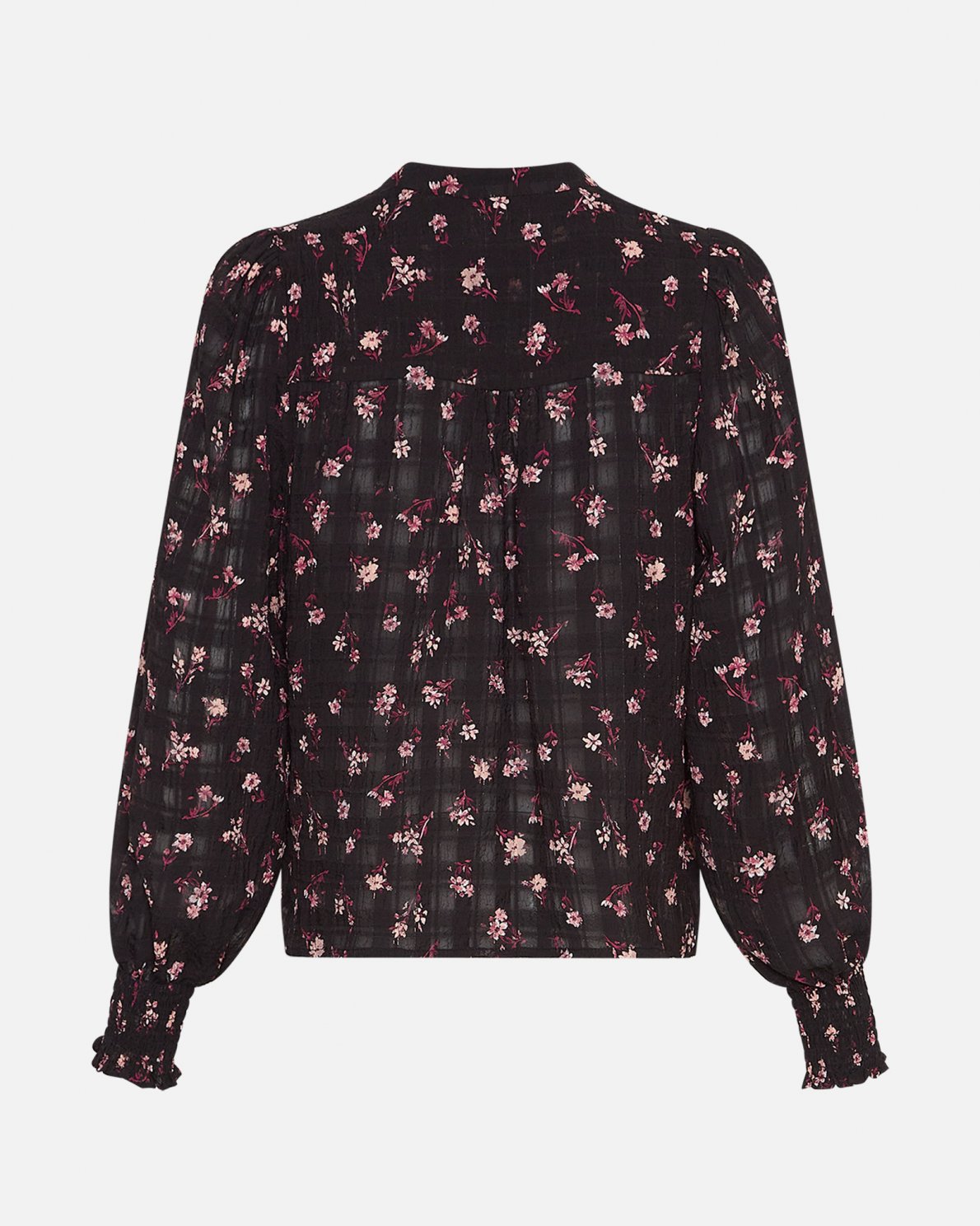 The Anetta shirt is a feminine shirt filled with small little details. It features long sleeves with gatherings at the shoulder to create a small puff and leastic cuffs, it has a mandarin collar and is created in a fine almost mesh material making the shirt light despite it's dark colours.