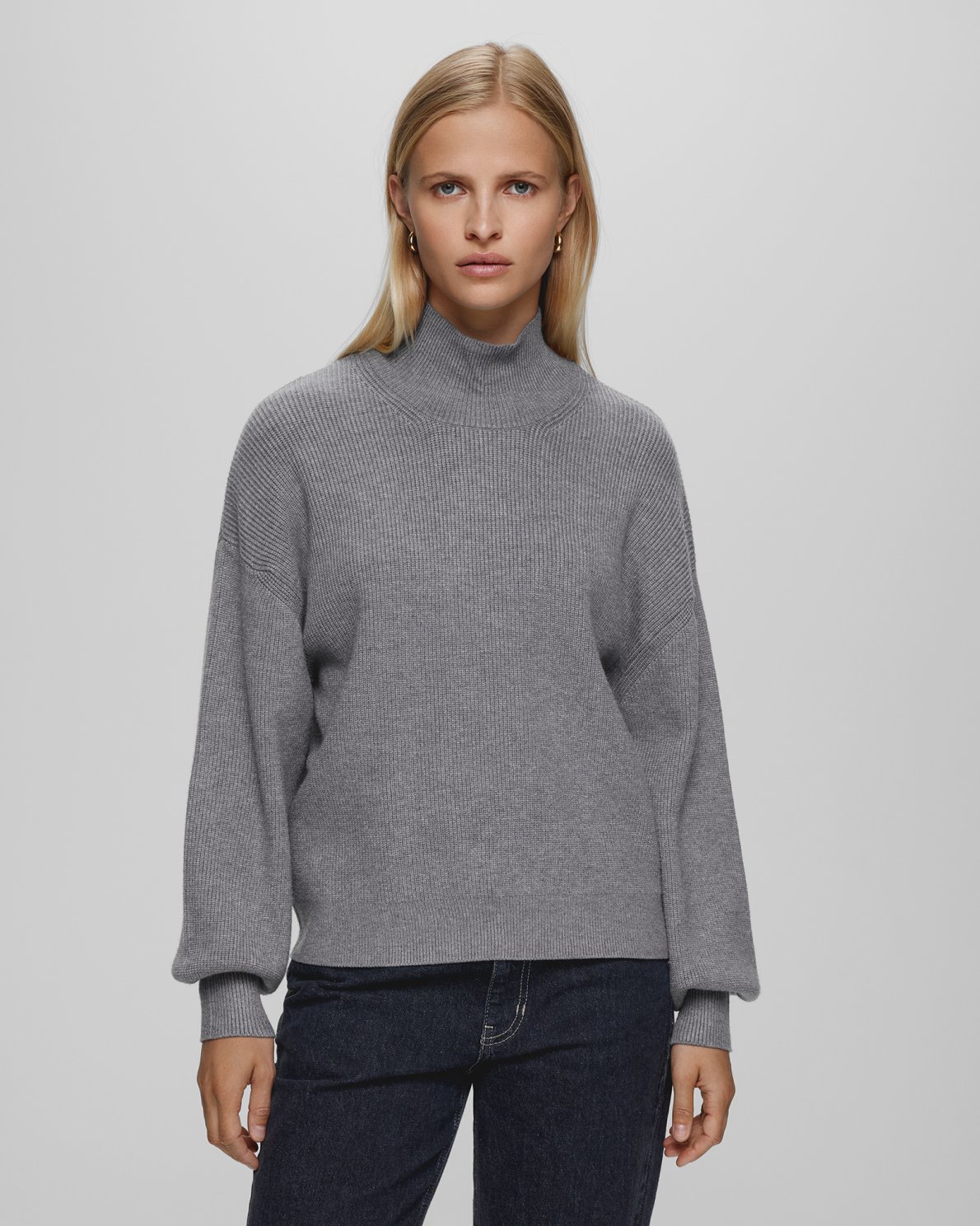 Magnea is the perfect rib pullover that comes with a very trendy oversized fit, giving you a bit of a boxy look, yet hugging your skin tight at the high rib cuffs. It features dropped shoulders with loose fitted sleeves and high neck. It is a perfect addition of a chic and casual outfit, paired with skinny jeans or a pair of statement high-waist jeans.