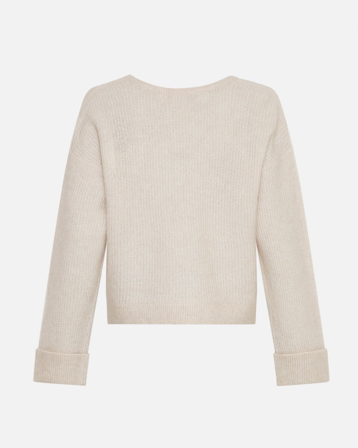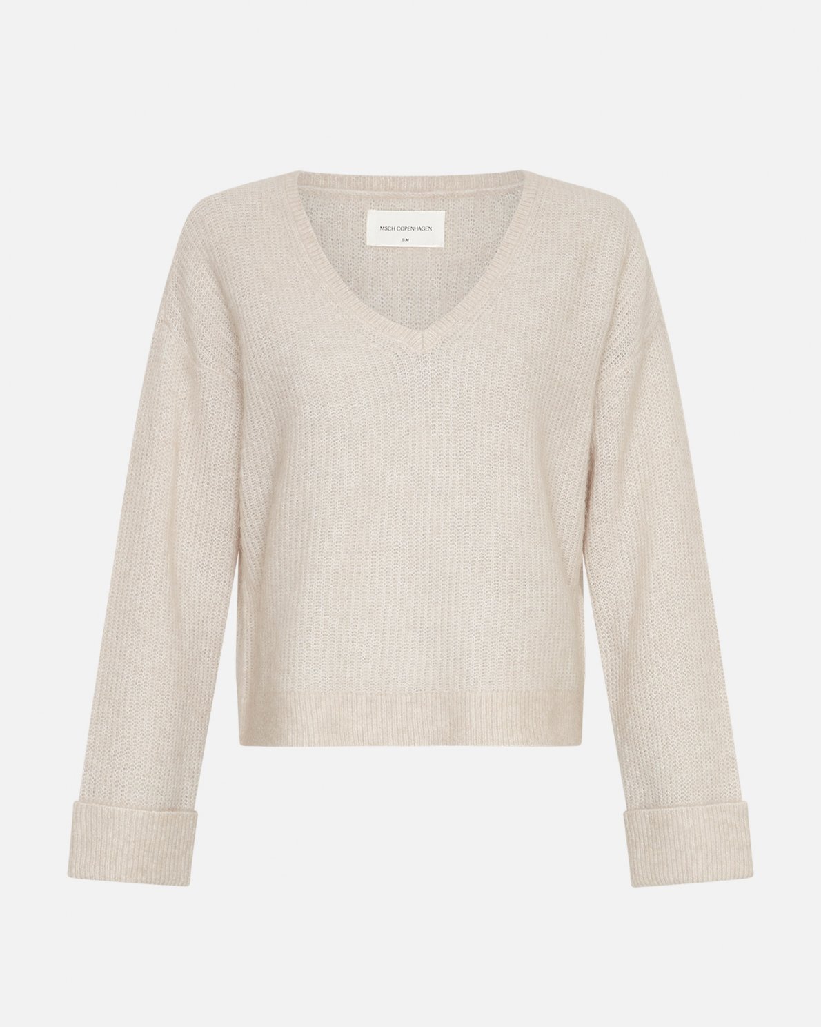 The Evonna pullover is a soft knitted quality, that features a V-neck cut with straight sleeves with a fold up detail. The length of the pullover is short yet not cropped, we advice to style this pullover with a pair of high waisted jeans or trousers.