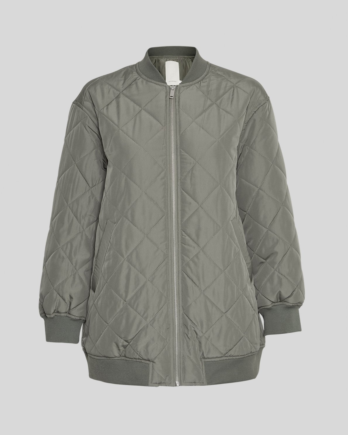 This jacket is a mixture of a classic quilted jacket and a bomber jacket. It features a ribbed elastic edge around the neck as a collar-like feature and at the bottom of the jacket and cuffs. There is zipper closure and side pockets.
