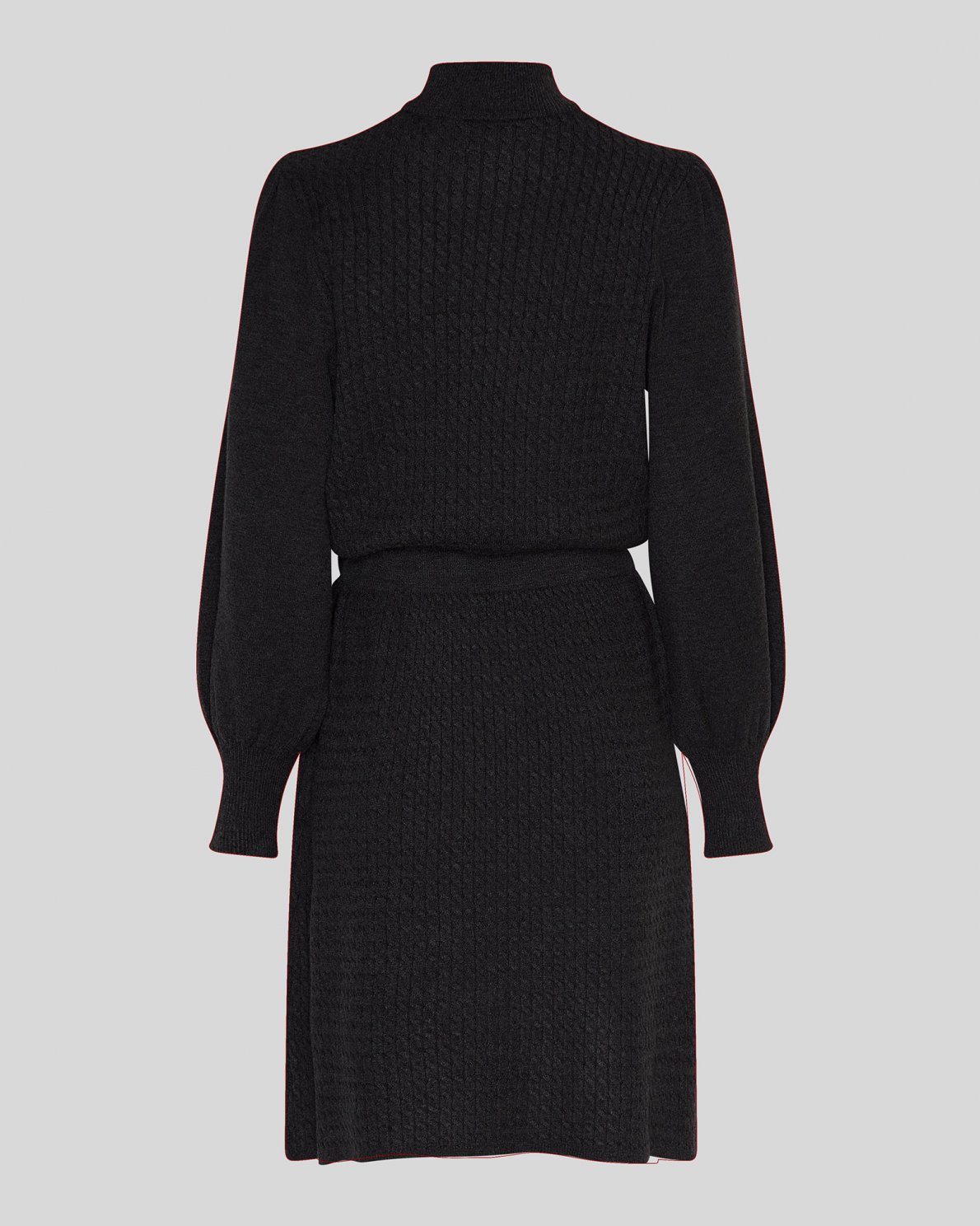 The Amari knitted dress, is made in a thick quality. The fabric is a mic of cable knit and a classic smooth knit. There is an elastic waistband to help enhance your waistline. The dress features a mock neck and long sleeves.