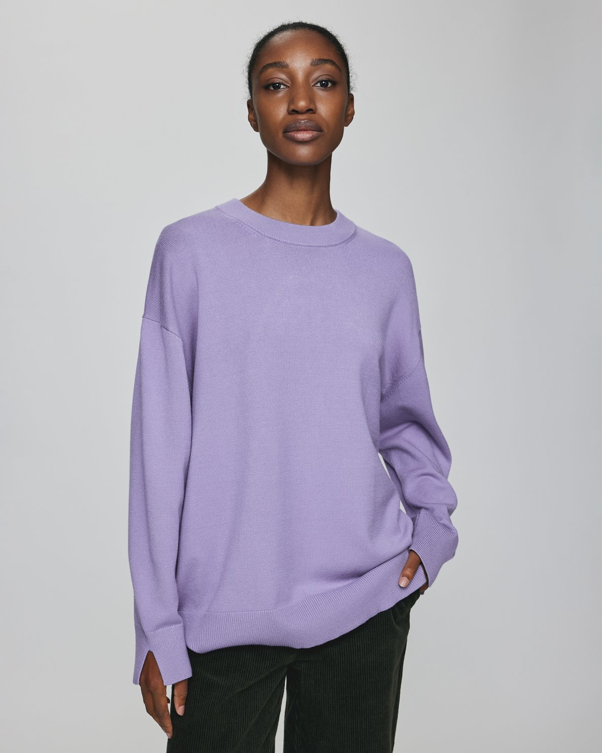 This pullover has a loose fit. The model is 173cm and wears a S/M.