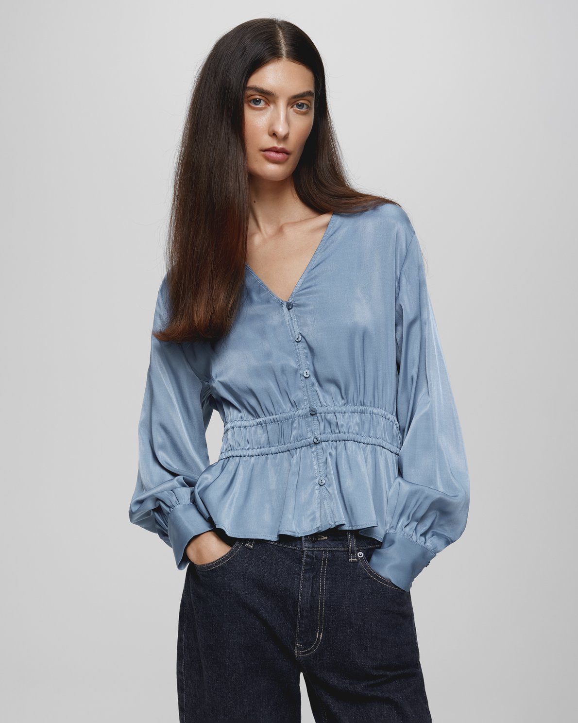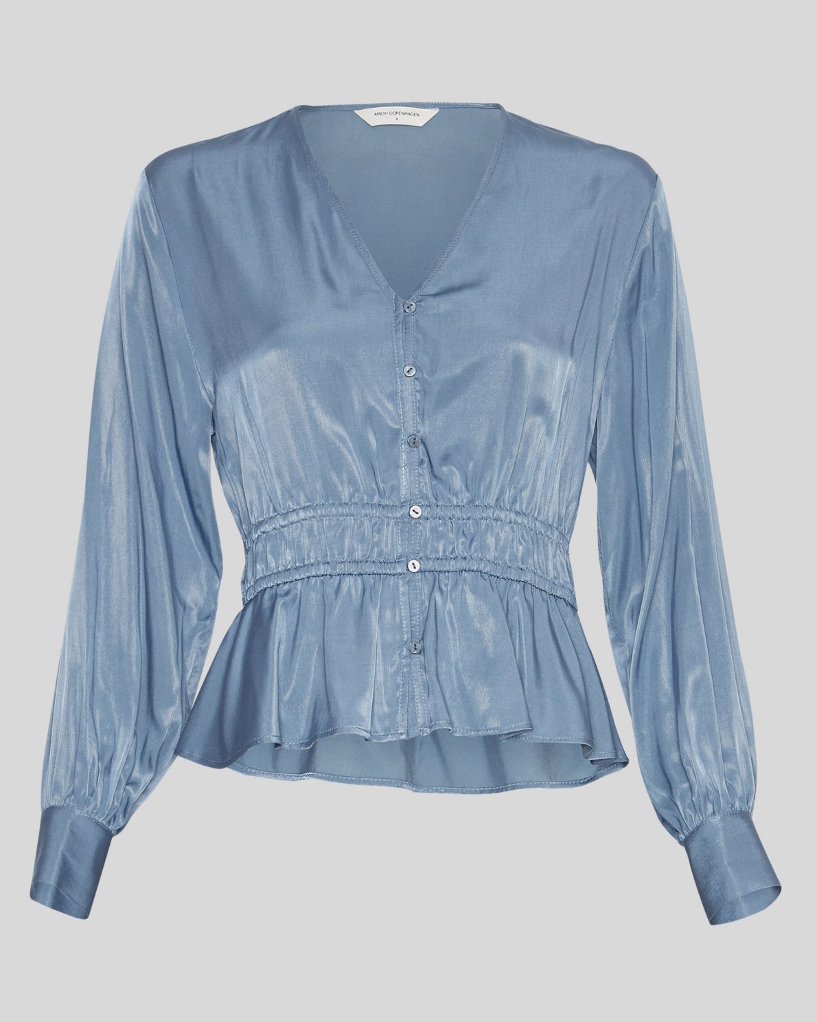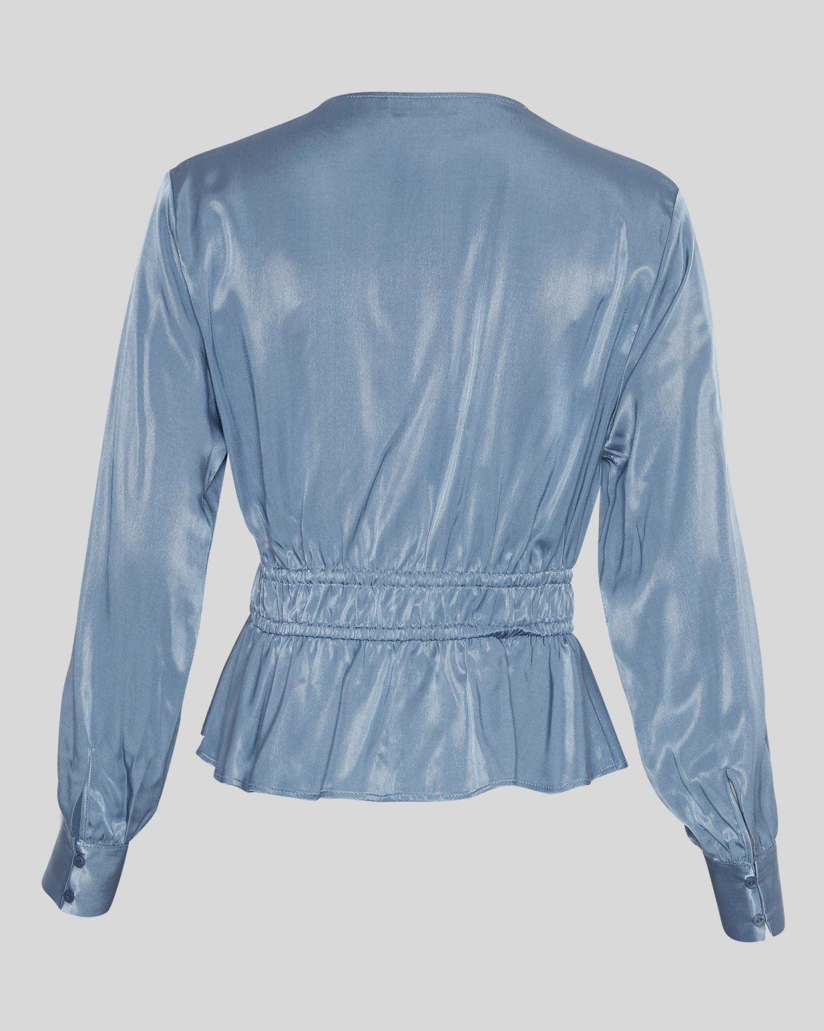 The Nicholina shirt is a combination of classic and trendy with a touch of beautiful detail as a ribbon and small buttons. It's lightweight and flowy, with ballon sleeves, a classic v-neck and cuffs. The light blue colour and the shiny look to the material makes it perfect for dressing up jeans, or used in a more formal occasion.