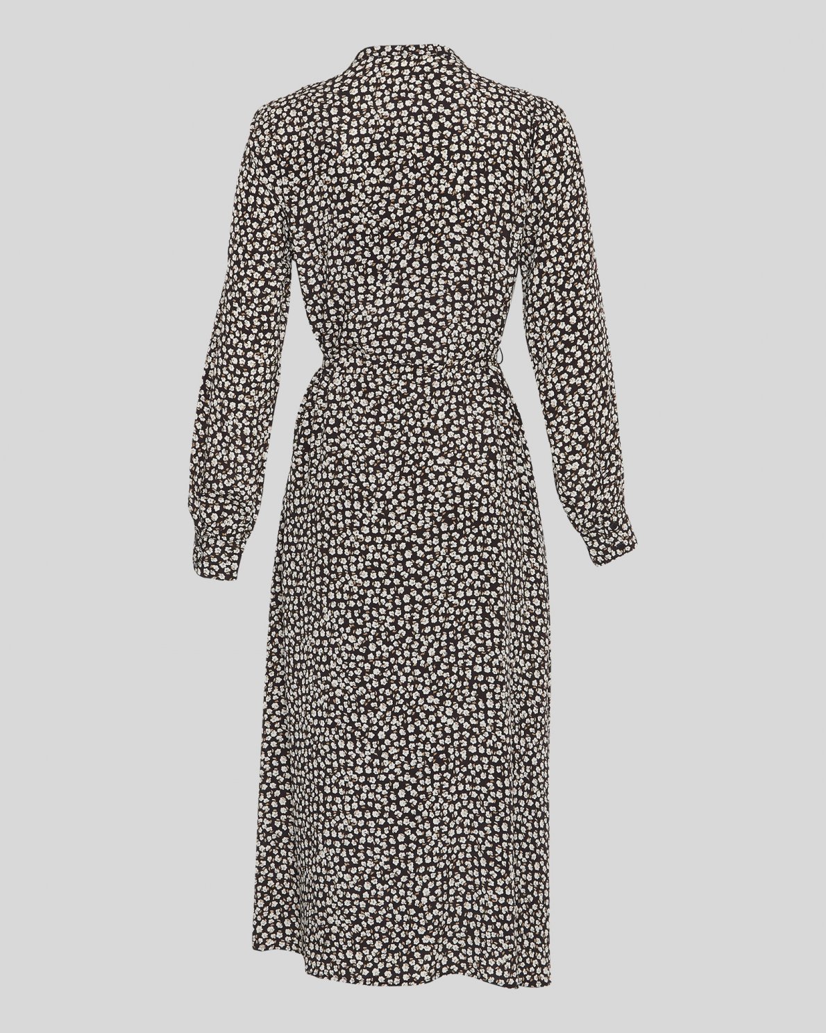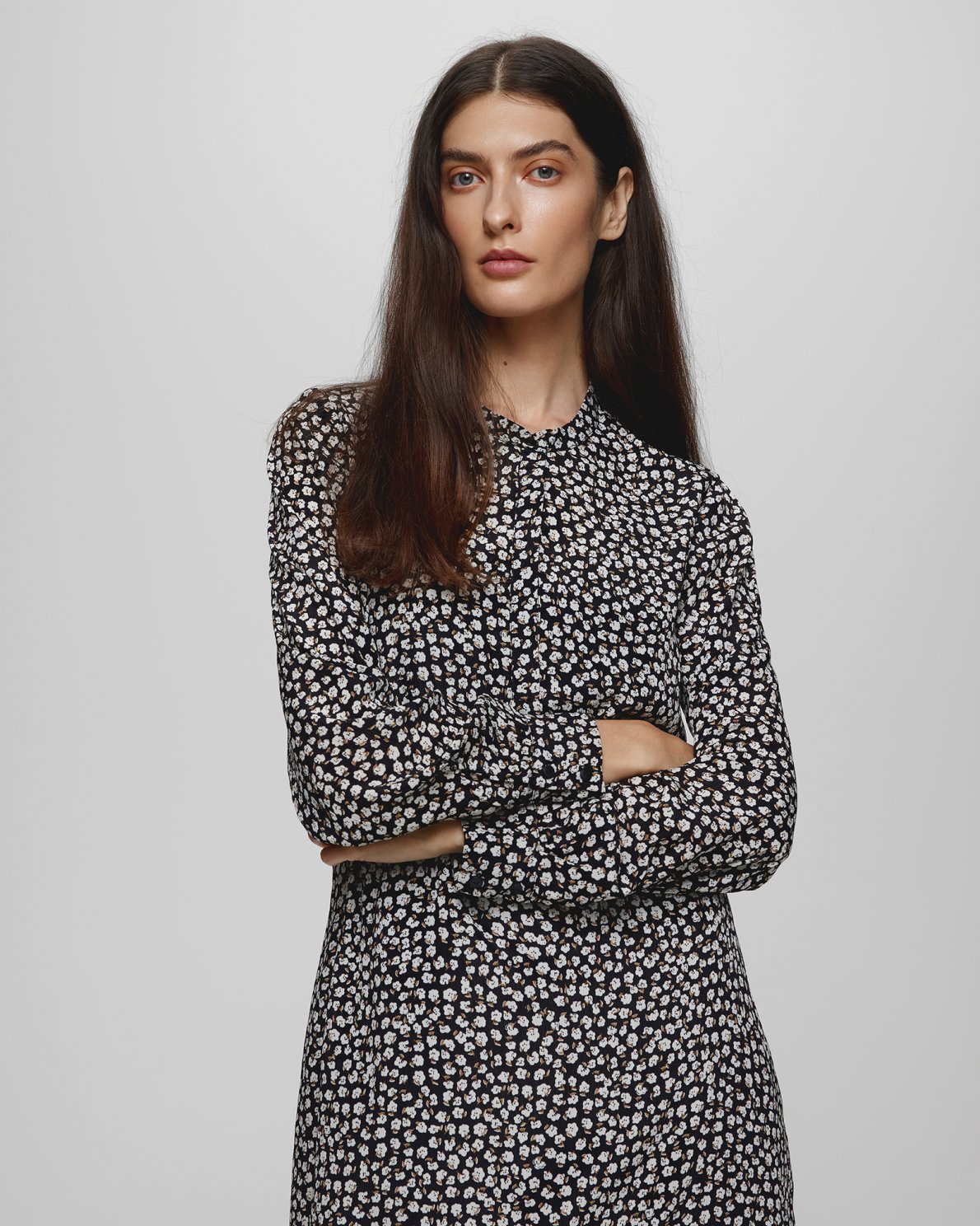 The Zeida dress is designed from a beautiful black fabric with a delicate white floral print. Featuring long sleeves, a small collar, and elegant cuffs, this full length dress is the perfect everyday piece, thanks to its lightweight and comfortable design. Style it with black accessories for a complete autumn look, or add your favorite bright accents to lighten up your outfit.