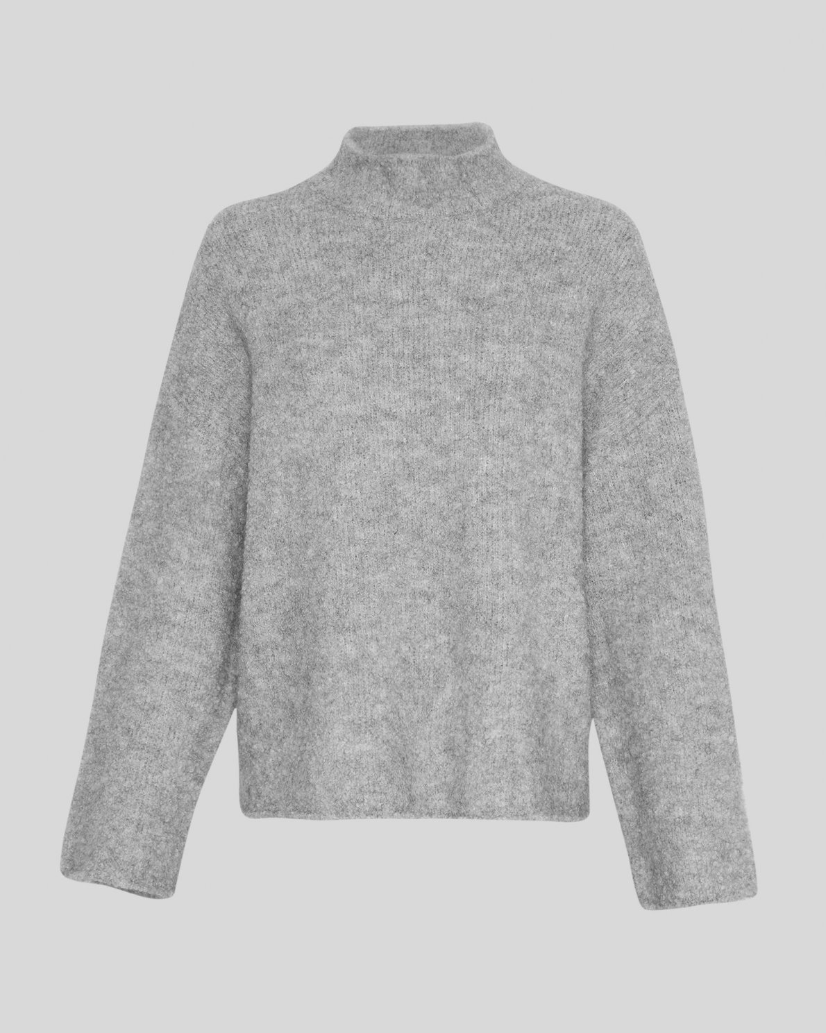 The Bathilda Erica Pullover in light grey melange is a luxurious knit crafted from a blend of alpaca wool, offering both warmth and softness. This high-neck sweater features a relaxed, slightly oversized fit with dropped shoulders, creating a cozy and effortless silhouette. The plush texture of the alpaca wool ensures comfort and breathability, making it perfect for layering in cooler weather. Whether paired with jeans or a skirt, this versatile pullover is a timeless addition to your wardrobe, blending elegance with the natural qualities of alpaca wool.