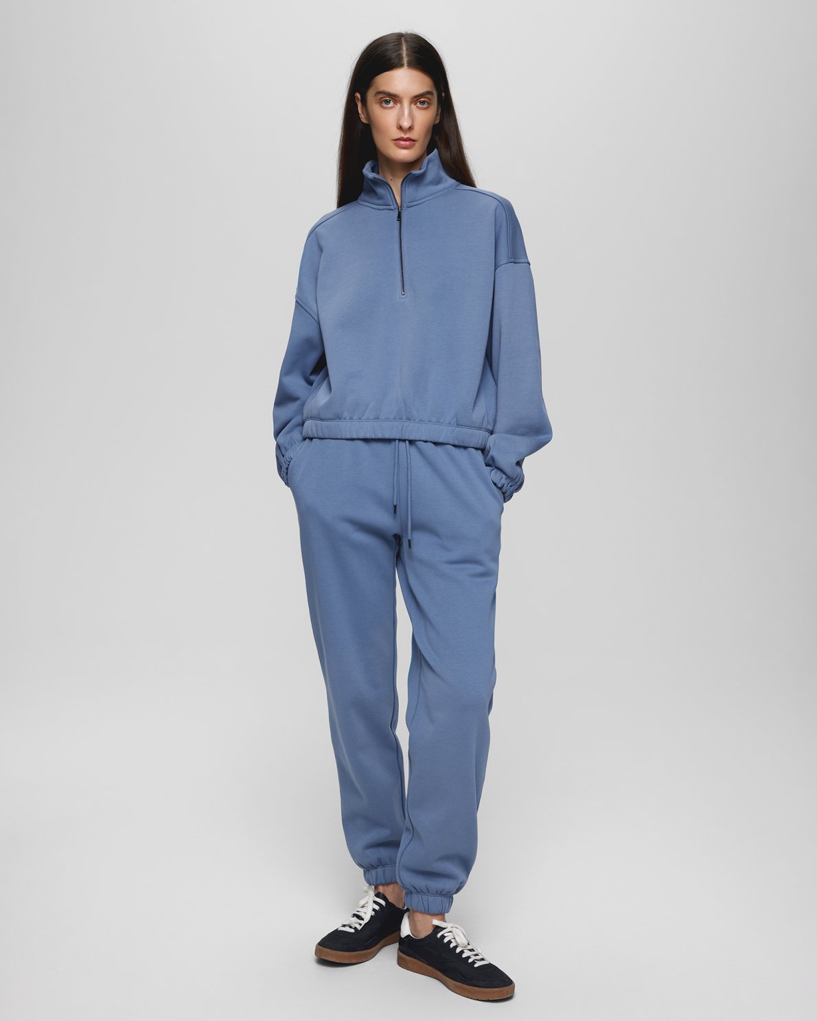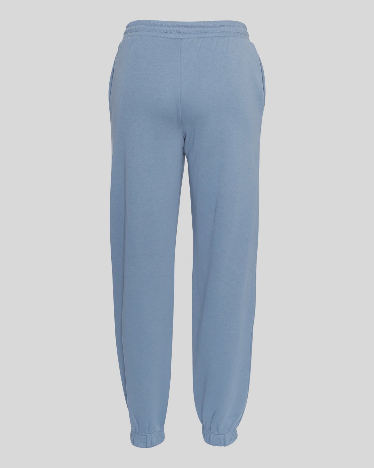 A pair of classic sweatpants with elastic waist with tie strings and elastic cuffs. They feature side pockets. The material is in the thicker quality and still ultra soft. Lift up your loungewear with this stunning blue set.