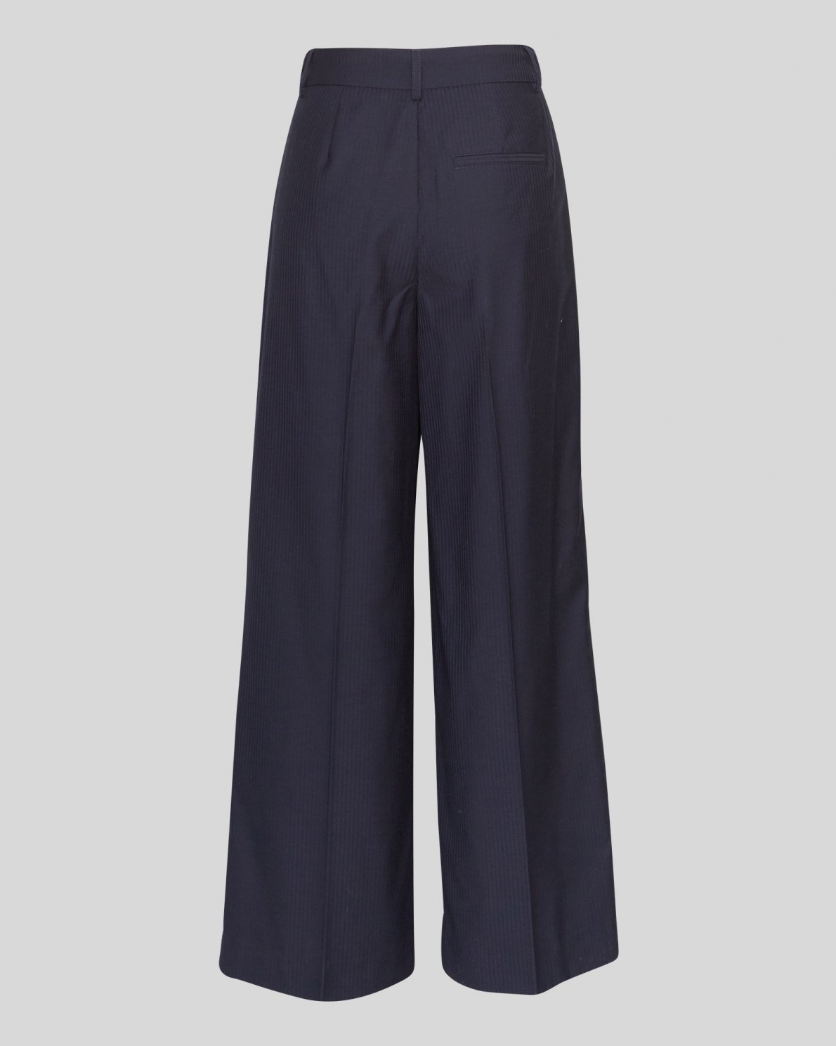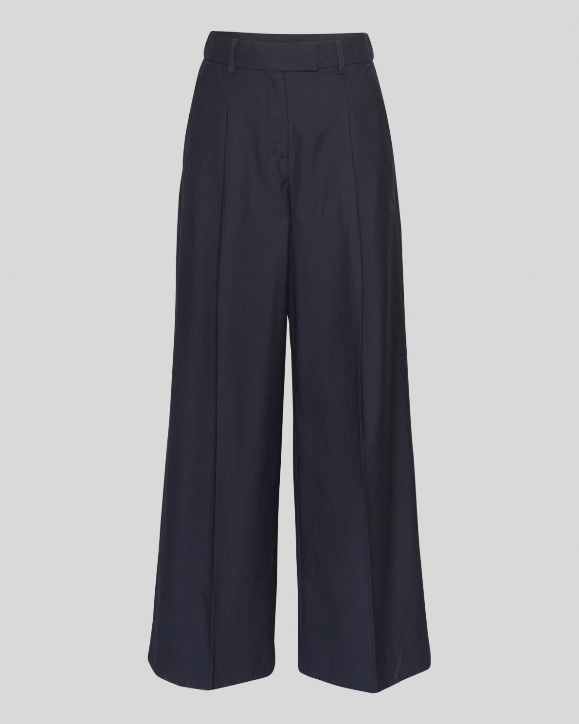 The Maelynn HW Pants STP are crafted from a premium wool blend, offering a refined tailoring finish and the natural warmth of wool. These high-waisted pants feature a wide-leg silhouette for a modern, elegant look, perfect for both casual and formal occasions. The design includes a button and zipper closure for a secure fit, along with belt loops for added versatility in styling. The subtle stripe pattern adds a sophisticated touch, while the wool blend ensures both comfort and style. Pair them with the matching blazer or vest for a chic, coordinated outfit that is ideal for cooler weather.