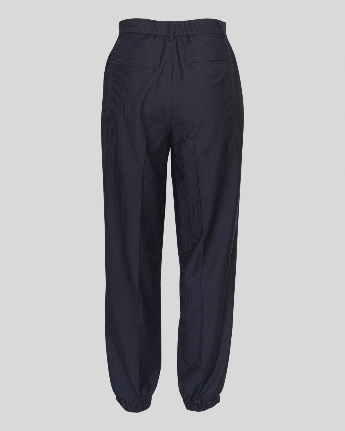 The Maelynn Pants STP are expertly crafted from a luxurious wool blend, offering both warmth and a refined tailoring finish. The wool in the fabric provides natural insulation while ensuring a sleek and polished appearance, perfect for both casual and formal settings. These pants feature a relaxed, straight-leg silhouette with subtle stripes, and an elastic waistband for added comfort and ease of movement. The elasticated cuffs at the ankles add a modern touch and create a tapered look, enhancing the overall fit. Pair them with the matching blazer or vest for a complete, tailored ensemble ideal for cooler seasons.