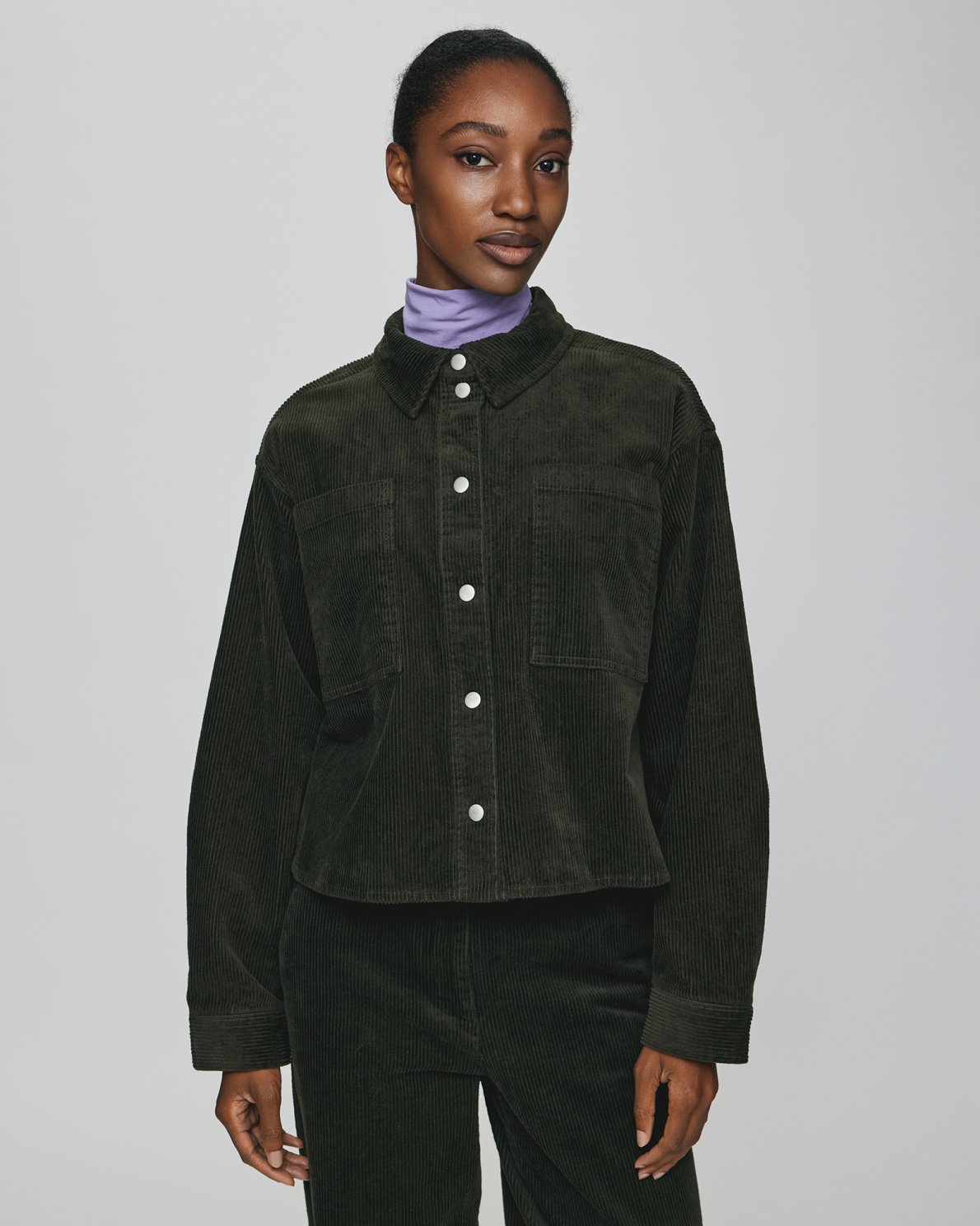 A minimalistic corduroy overshirt that blends fashion with comfort. It is designed with a corduroy fabric, offering a cozy and soft texture, perfect for the colder seasons as a layering piece. This silhouette features a double front pocket, adding a touch of utility while maintaining a sleek and chic look. The button closure adds a functional detail, allowing you to wear it open or closed, depending on your style.
